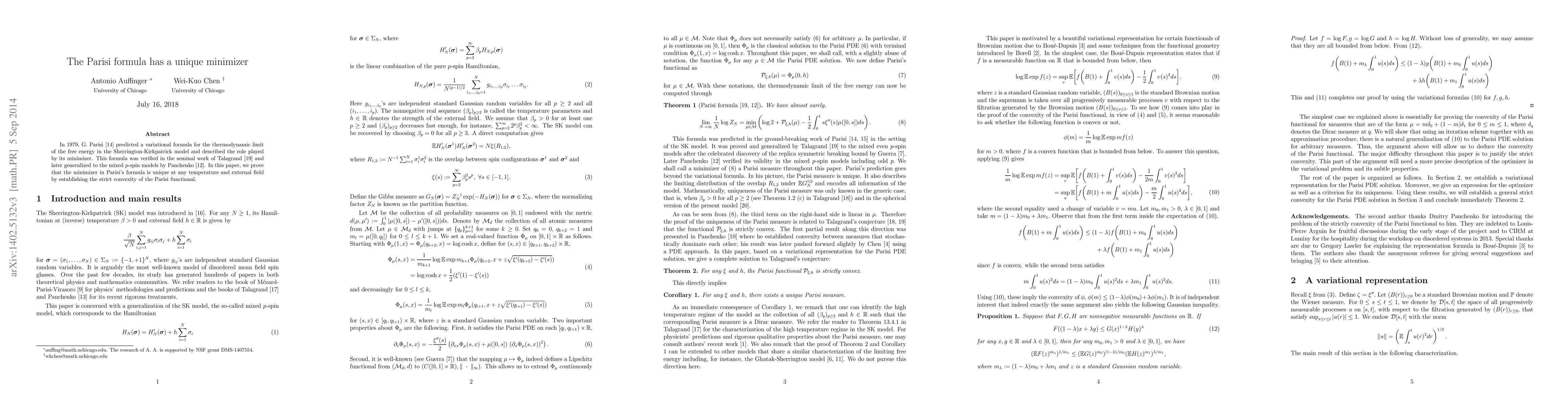 This paper proves the uniqueness of the minimizer in Parisi's formula for the Sherrington-Kirkpatrick model and its generalizations, demonstrating the strict convexity of the Parisi functional across all temperatures and external fields.