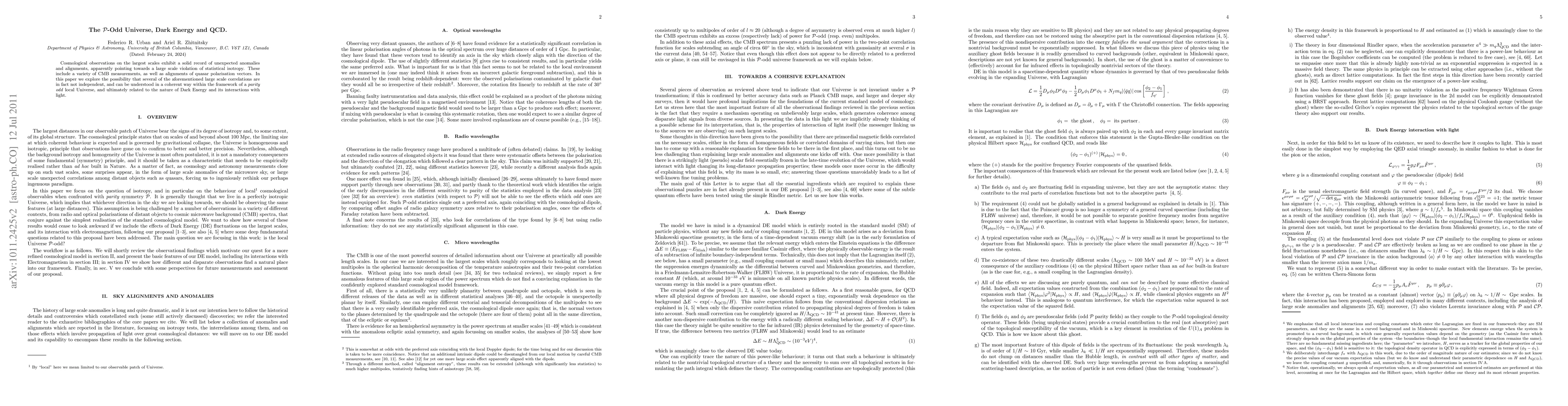 Research explores connections between large-scale cosmic anomalies, Dark Energy, and QCD (Quantum Chromodynamics), suggesting a parity odd universe as a unifying framework.