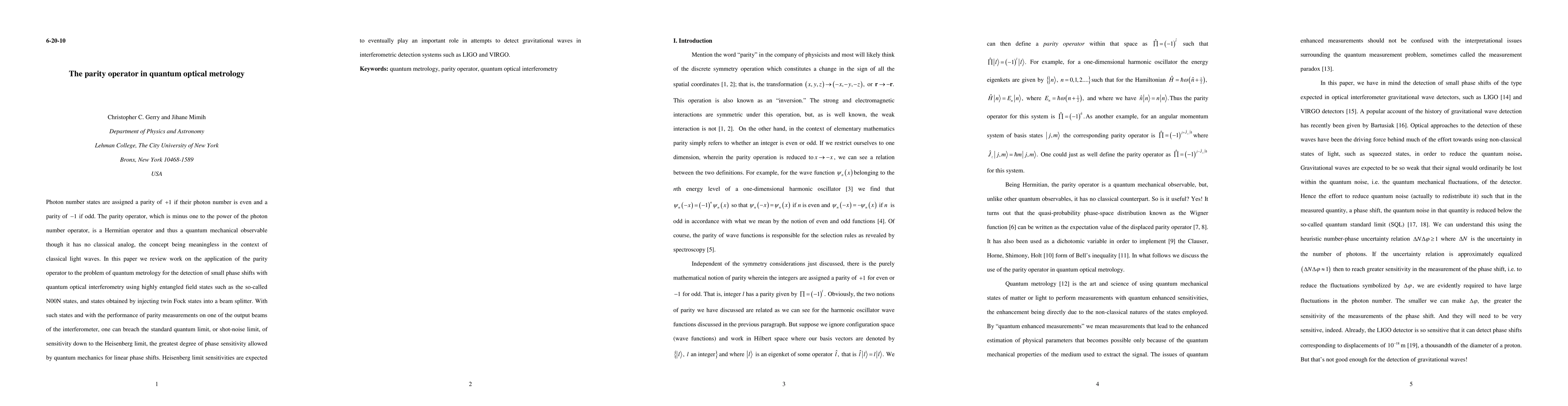This paper reviews the application of the parity operator in quantum optical metrology to achieve Heisenberg limit sensitivities for detecting small phase shifts, surpassing the standard quantum limit, using highly entangled states like N00N states. Such advancements are crucial for enhancing the sensitivity of gravitational wave detectors like LIGO and VIRGO.
