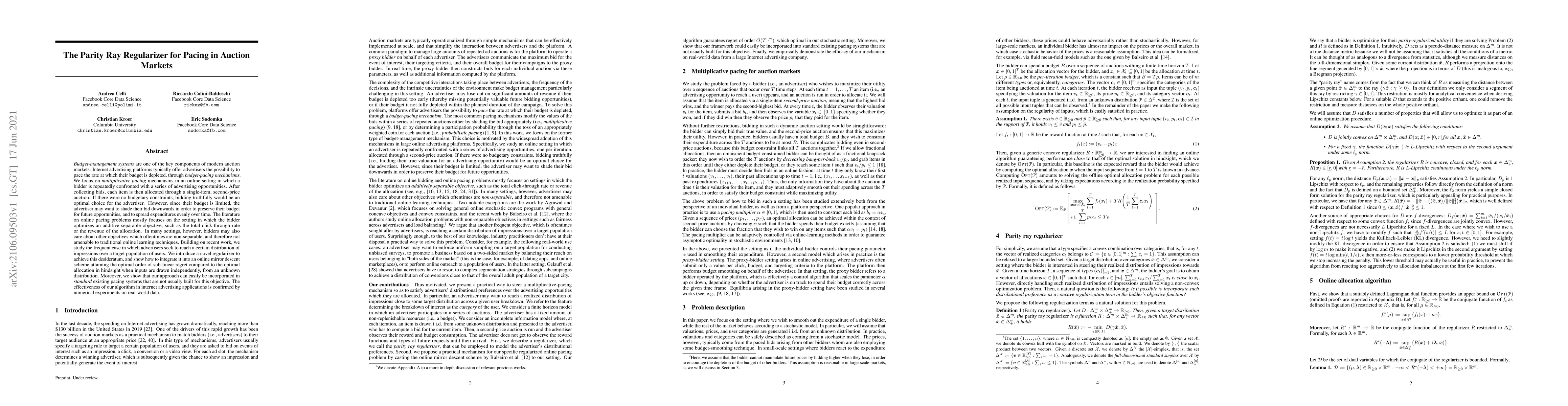 This paper introduces a novel "Parity Ray Regularizer" to manage budget pacing in online auction markets, enabling advertisers to spread expenditures evenly over time while achieving a desired distribution of impressions. The proposed method integrates into online mirror descent, achieving optimal sub-linear regret and is shown to be effective through experiments on real-world data.