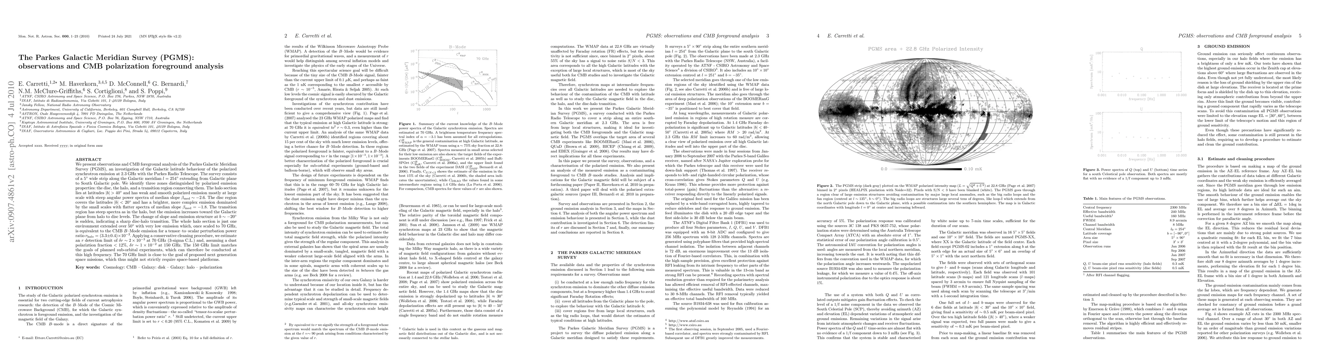 We present observations and CMB foreground analysis of the Parkes Galactic Meridian Survey (PGMS), an investigation of the Galactic latitude behaviour of the polarized synchrotron emission at 2.3 GHz with the Parkes Radio Telescope. The survey consists of a 5-deg wide strip along the Galactic meridian l=254-deg extending from Galactic plane to South Galactic pole. We identify three zones distinguished by polarized emission properties: the disc, the halo, and a transition region connecting them. The halo section lies at latitudes |b| > 40-deg and has weak and smooth polarized emission mostly at large scale with steep angular power spectra of median slope $\beta_{\rm med} \sim -2.6$. The disc region covers the latitudes |b|<20-deg and has a brighter, more complex emission dominated by the small scales with flatter spectra of median slope $\beta_{\rm med} = -1.8$. The transition region has steep spectra as in the halo, but the emission increases toward the Galactic plane from halo to disc levels. The change of slope and emission structure at $b \sim -20\degr$ is sudden, indicating a sharp disc-halo transition. The whole halo section is just one environment extended over 50-deg with very low emission which, once scaled to 70GHz, is equivalent to the CMB B-Mode emission for a tensor-to-scalar perturbation power ratio r_halo = 3.3 +/- 0.4 x 10^{-3}. Applying a conservative cleaning procedure, we estimate an r detection limit of $\delta r \sim 2\times 10^{-3}$ at 70~GHz (3-sigma C.L.) and, assuming a dust polariztion fraction <12%, $\delta r \sim 1\times 10^{-2}$ at 150~GHz. The 150-GHz limit matches the goals of planned sub-orbital experiments, which can therefore be conducted at this high frequency. The 70-GHz limit is close to the goal of proposed next generation space missions, which thus might not strictly require space-based platforms.