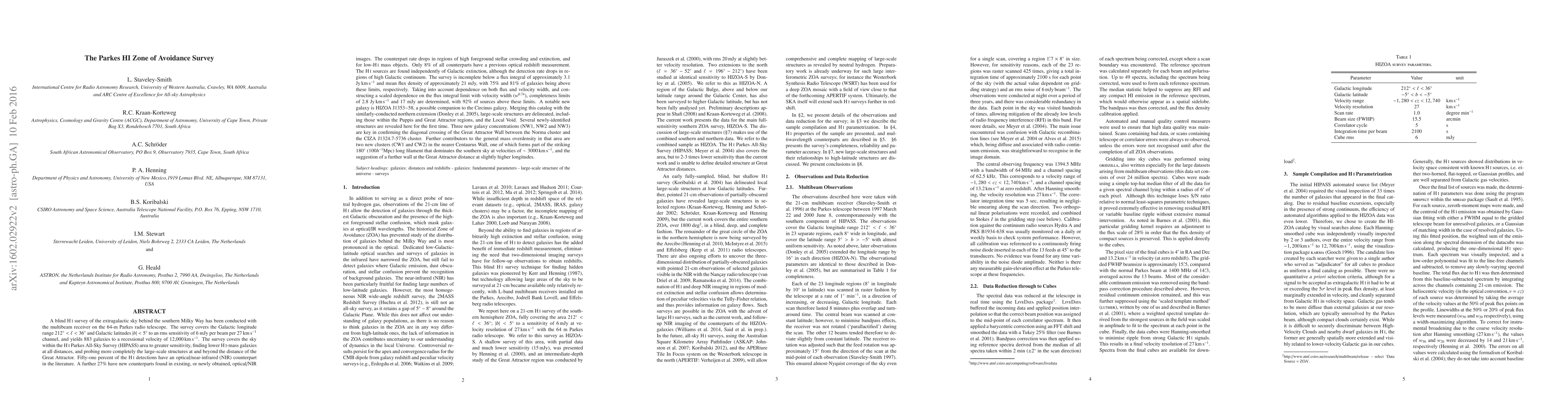 The Parkes HI Zone of Avoidance Survey identifies 883 galaxies behind the southern Milky Way, revealing large-scale structures including the Great Attractor and the Local Void. It discovers new galaxy concentrations and clusters, notably confirming the diagonal crossing of the Great Attractor Wall.