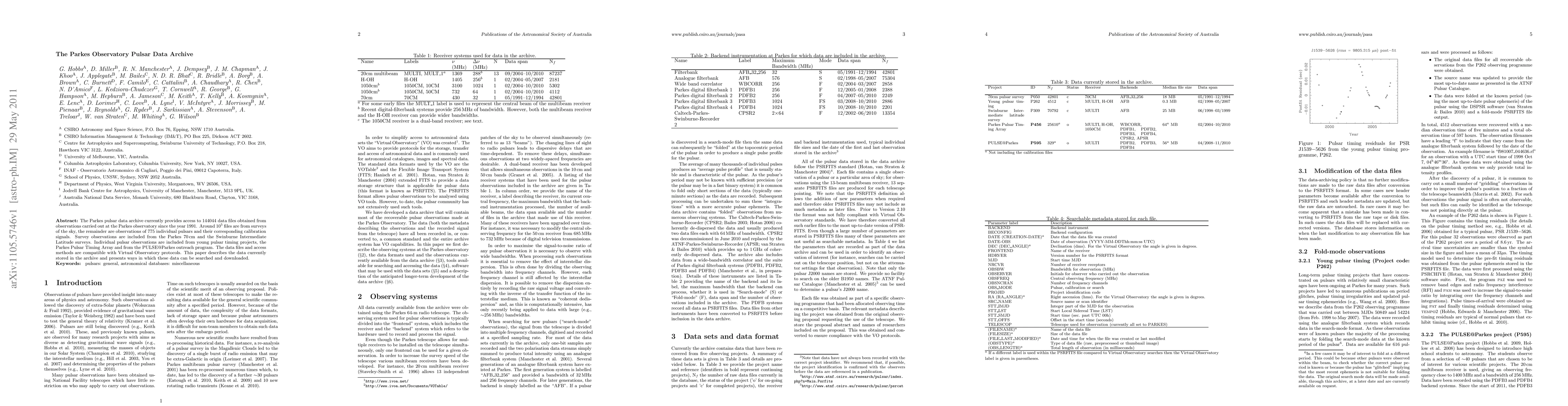 The Parkes Observatory Pulsar Data Archive contains 144,044 data files from observations since 1991, including sky surveys and individual pulsar observations. The archive is compatible with Virtual Observatory protocols and provides methods for searching and downloading the data.