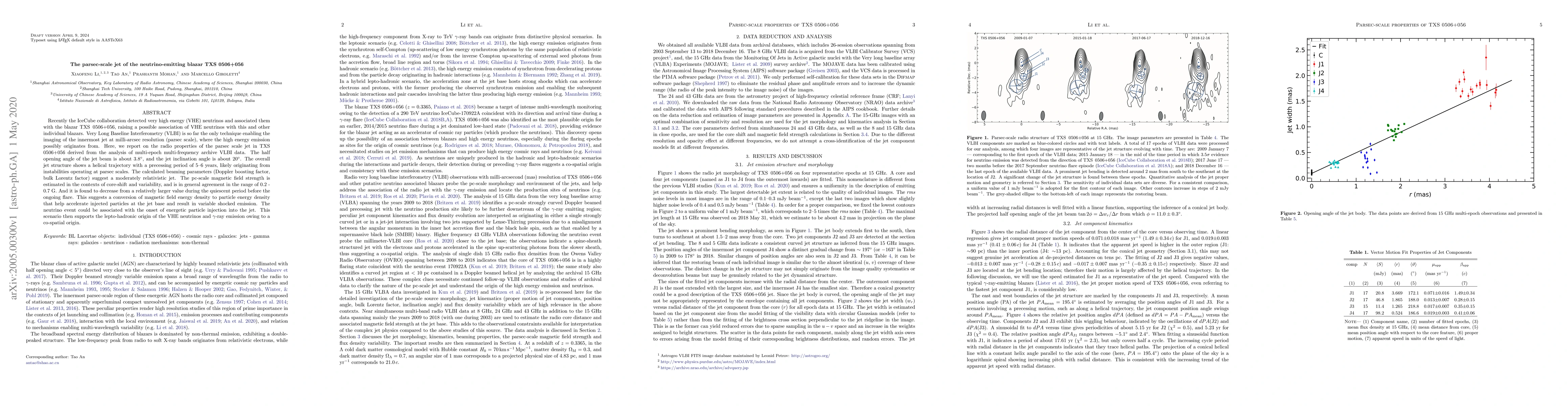 Recently the IceCube collaboration detected very high energy (VHE) neutrinos and associated them with the blazar \txs{}, raising a possible association of VHE neutrinos with this and other individual blazars. Very Long Baseline Interferometry (VLBI) is so far the only technique enabling the imaging of the innermost jet at milli-arcsec resolution (parsec scale), where the high energy emission possibly originates from. Here, we report on the radio properties of the parsec scale jet in \txs{} derived from the analysis of multi-epoch multi-frequency archive VLBI data. The half opening angle of the jet beam is about 3.8\degr, and the jet inclination angle is about 20\degr. The overall jet structure shows a helical trajectory with a precessing period of 5--6 years, likely originating from instabilities operating at parsec scales. The calculated beaming parameters (Doppler boosting factor, bulk Lorentz factor) suggest a moderately relativistic jet. The pc-scale magnetic field strength is estimated in the contexts of core-shift and variability, and is in general agreement in the range of 0.2 - 0.7 G. And it is found to decrease from a relatively larger value during the quiescent period before the ongoing flare. This suggests a conversion of magnetic field energy density to particle energy density that help accelerate injected particles at the jet base and result in variable shocked emission. The neutrino event could be associated with the onset of energetic particle injection into the jet. This scenario then supports the lepto-hadronic origin of the VHE neutrinos and $\gamma$-ray emission owing to a co-spatial origin.