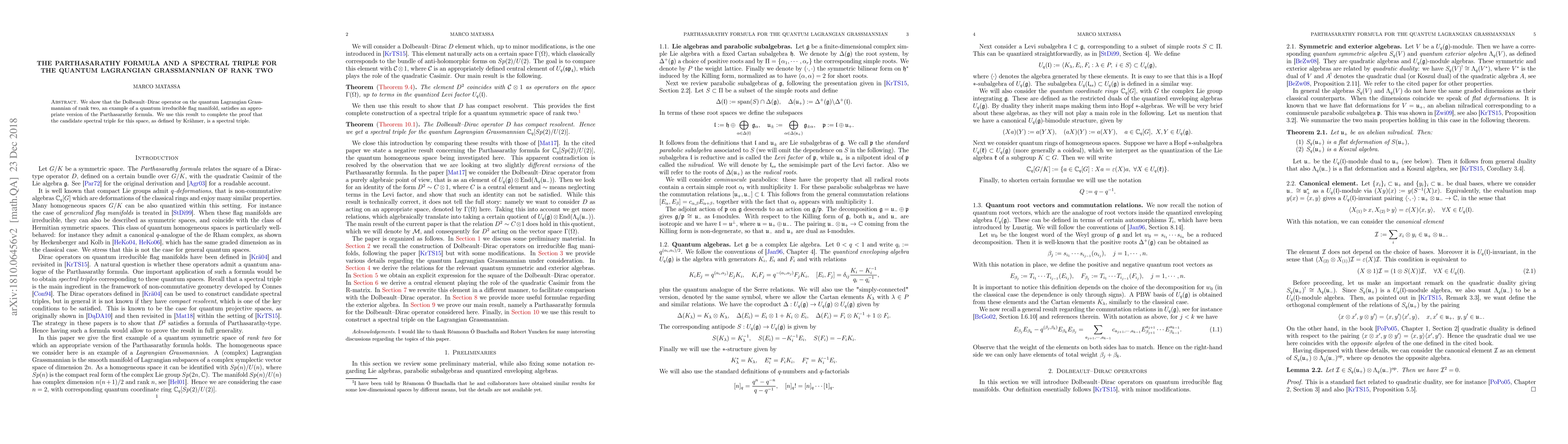 We show that the Dolbeault--Dirac operator on the quantum Lagrangian Grassmannian of rank two, an example of a quantum irreducible flag manifold, satisfies an appropriate version of the Parthasarathy formula. We use this result to complete the proof that the candidate spectral triple for this space, as defined by Kr\"ahmer, is a spectral triple.