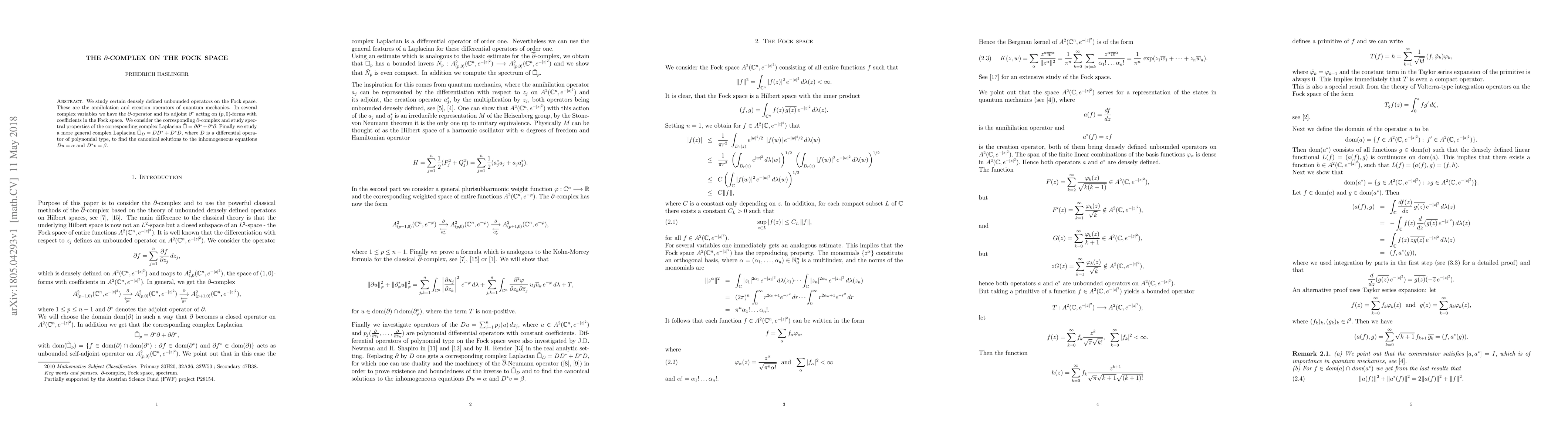 We study certain densely defined unbounded operators on the Fock space. These are the annihilation and creation operators of quantum mechanics. In several complex variables we have the $\partial$-operator and its adjoint $\partial^*$ acting on $(p,0)$-forms with coefficients in the Fock space. We consider the corresponding $\partial$-complex and study spectral properties of the corresponding complex Laplacian $\tilde \Box = \partial \partial^* + \partial^*\partial.$ Finally we study a more general complex Laplacian $\tilde \Box_D = D D^* + D^* D,$ where $D$ is a differential operator of polynomial type, to find the canonical solutions to the inhomogeneous equations $Du=\alpha$ and $D^*v=\beta.$