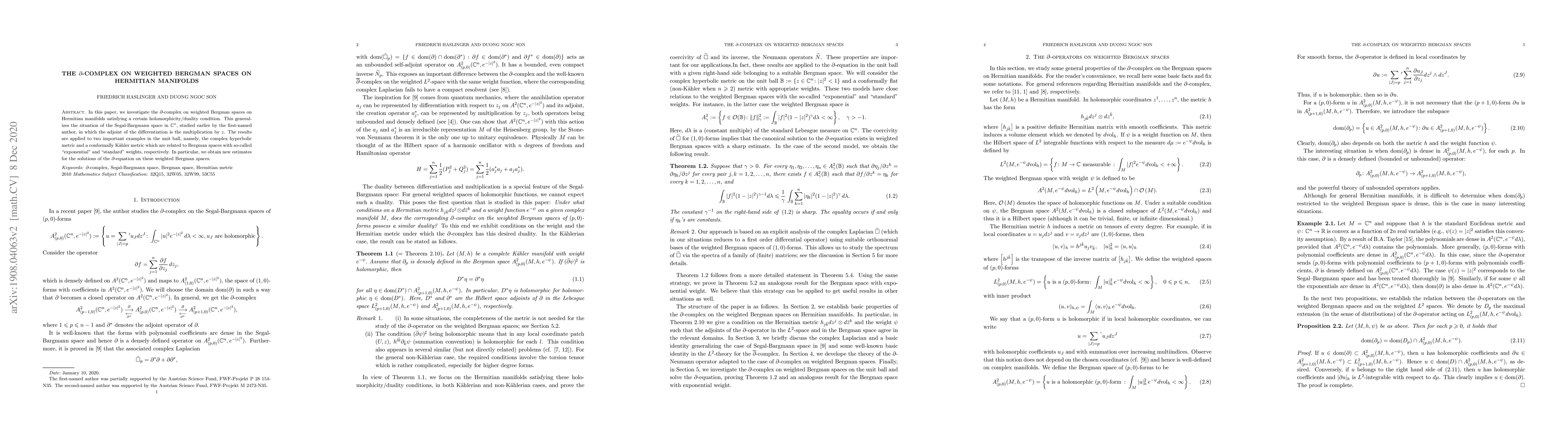 This paper explores the $\partial$-complex on weighted Bergman spaces on Hermitian manifolds, extending prior work on the Segal-Bargmann space in $\mathbb{C}^n$. It provides new estimates for the $\partial$-equation solutions in the context of complex hyperbolic and conformally Kähler metrics.