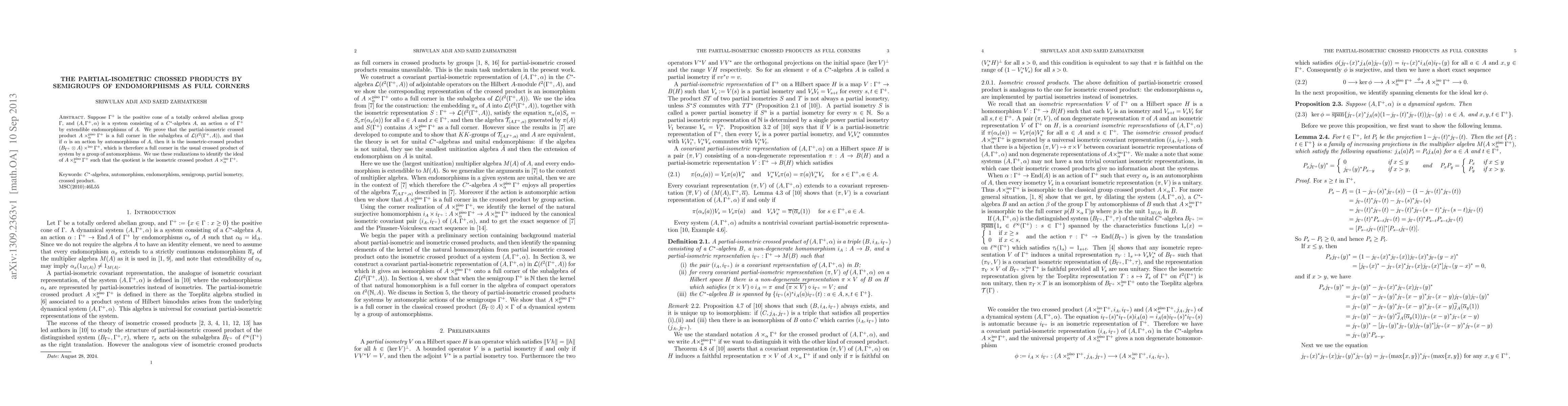 This paper proves that the partial-isometric crossed product $A\times_{\alpha}^{\piso}\Gamma^{+}$ is a full corner in $\L(\ell^{2}(\Gamma^{+},A))$, and when $\alpha$ is an automorphism, it becomes the isometric-crossed product $(B_{\Gamma^{+}}\otimes A)\times^{\iso}\Gamma^{+}$. It also identifies the ideal in $A\times_{\alpha}^{\piso}\Gamma^{+}$ whose quotient yields the isometric crossed product $A\times_{\alpha}^{\iso}\Gamma^{+}$.