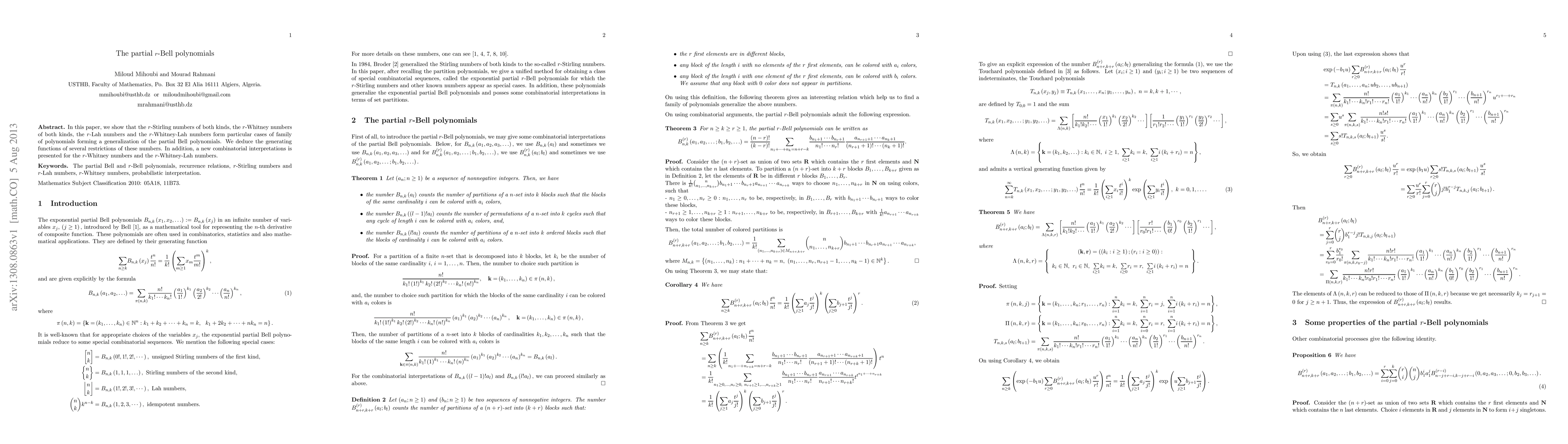 This paper generalizes partial Bell polynomials to introduce r-Bell polynomials, encompassing r-Stirling, r-Whitney, r-Lah, and r-Whitney-Lah numbers. It also provides generating functions for various restrictions of these numbers and new combinatorial interpretations for r-Whitney and r-Whitney-Lah numbers.