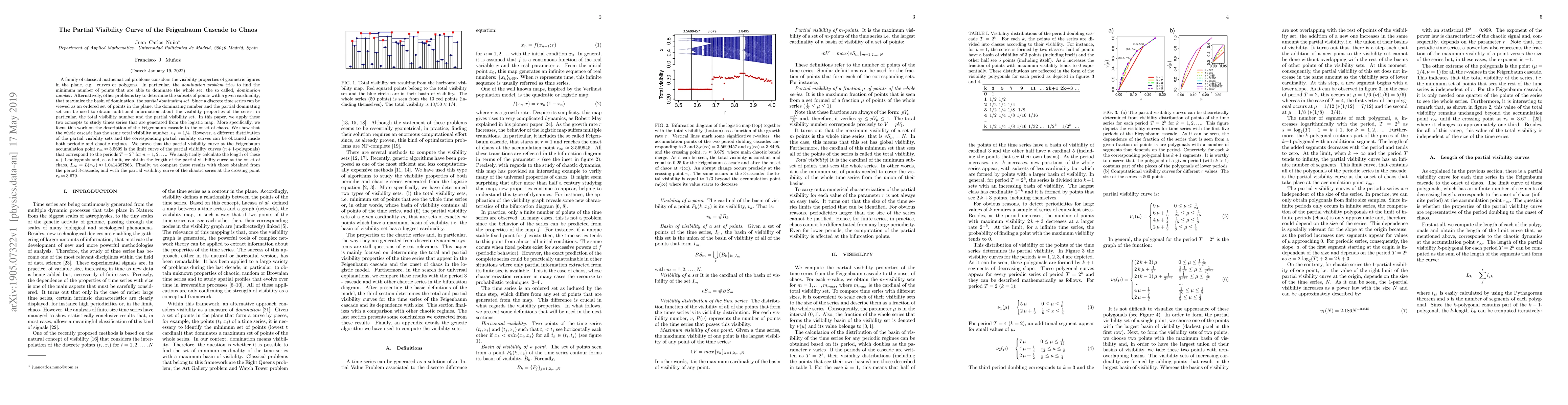 A family of classical mathematical problems considers the visibility properties of geometric figures in the plane, e.g. curves or polygons. In particular, the {\it domination problem} tries to find the minimum number of points that are able to dominate the whole set, the so called, {\it domination number}. Alternatively, other problems try to determine the subsets of points with a given cardinality, that maximize the basin of domination, the {\it partial dominating set}. Since a discrete time series can be viewed as an ordered set of points in the plane, the dominating number and the partial dominating set can be used to obtain additional information about the visibility properties of the series; in particular, the total visibility number and the partial visibility set. In this paper, we apply these two concepts to study times series that are generated from the logistic map. More specifically, we focus this work on the description of the Feigenbaum cascade to the onset of chaos. We show that the whole cascade has the same total visibility number, $v_T=1/4$. However, a different distribution of the partial visibility sets and the corresponding partial visibility curves can be obtained inside both periodic and chaotic regimes. We prove that the partial visibility curve at the Feigenbaum accumulation point $r_{\infty} \approx 3.5699$ is the limit curve of the partial visibility curves ($n+1$-polygonals) that correspond to the periods $T=2^{n}$ for $n=1,2,\ldots$. We analytically calculate the length of these $n+1$-polygonals and, as a limit, we obtain the length of the partial visibility curve at the onset of chaos, $L_{\infty} = L(r_{\infty}) \approx 1.0414387863$. Finally, we compare these results with those obtained from the period 3-cascade, and with the partial visibility curve of the chaotic series at the crossing point $r_c \approx 3.679$.
