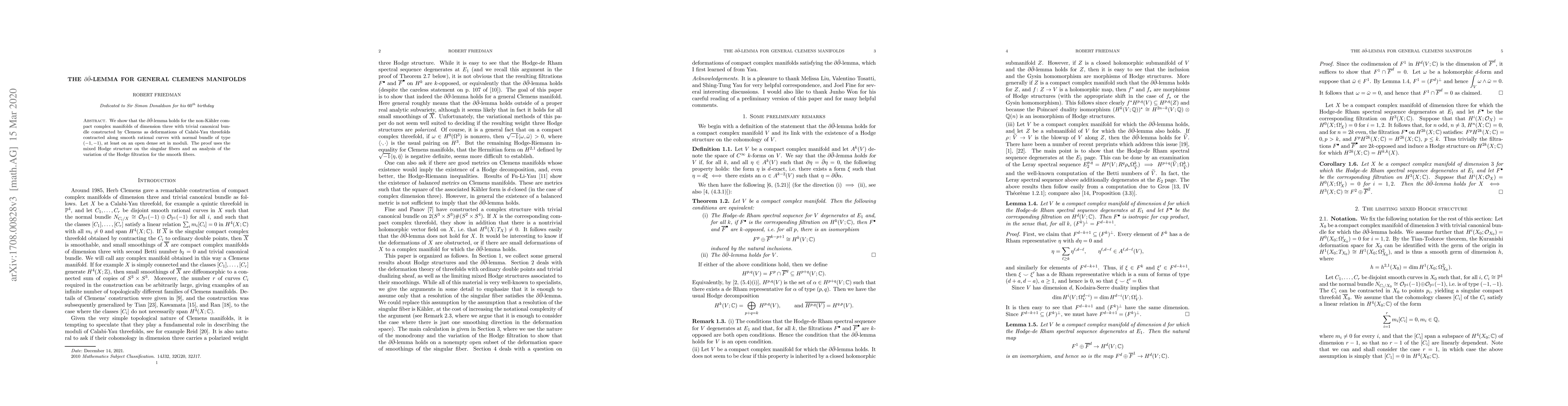 We show that the $\partial\bar{\partial}$-lemma holds for the non-K\"ahler compact complex manifolds of dimension three with trivial canonical bundle constructed by Clemens as deformations of Calabi-Yau threefolds contracted along smooth rational curves with normal bundle of type $(-1, -1)$, at least on an open dense set in moduli. The proof uses the mixed Hodge structure on the singular fibers and an analysis of the variation of the Hodge filtration for the smooth fibers.