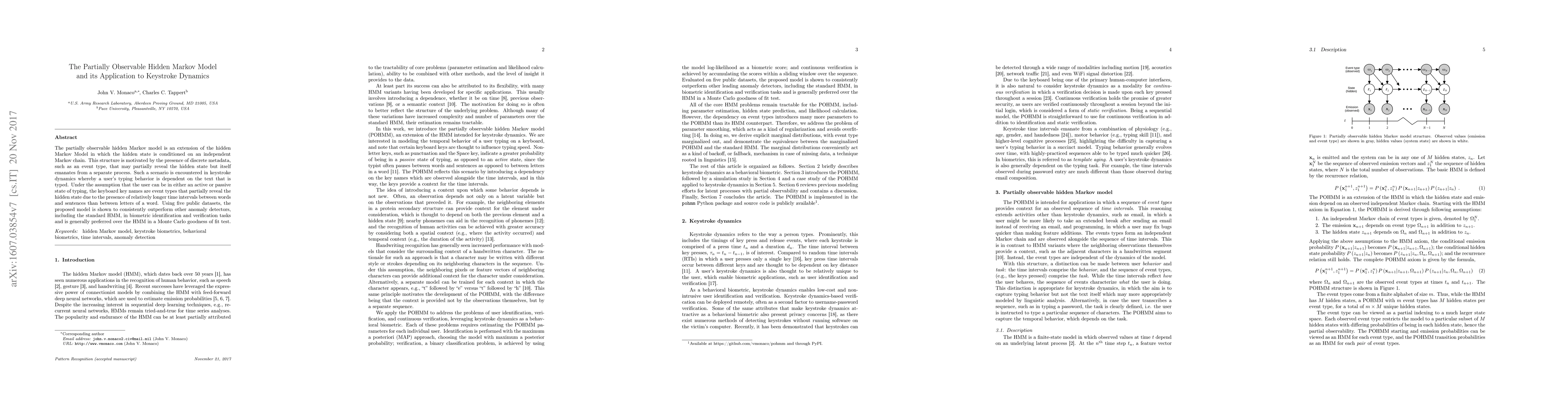 The partially observable hidden Markov model (POHMM) extends the standard HMM to incorporate discrete metadata that partially reveals the hidden state, effectively applied to keystroke dynamics for improved biometric identification. The POHMM outperforms standard HMMs in anomaly detection and verification tasks across multiple datasets.
