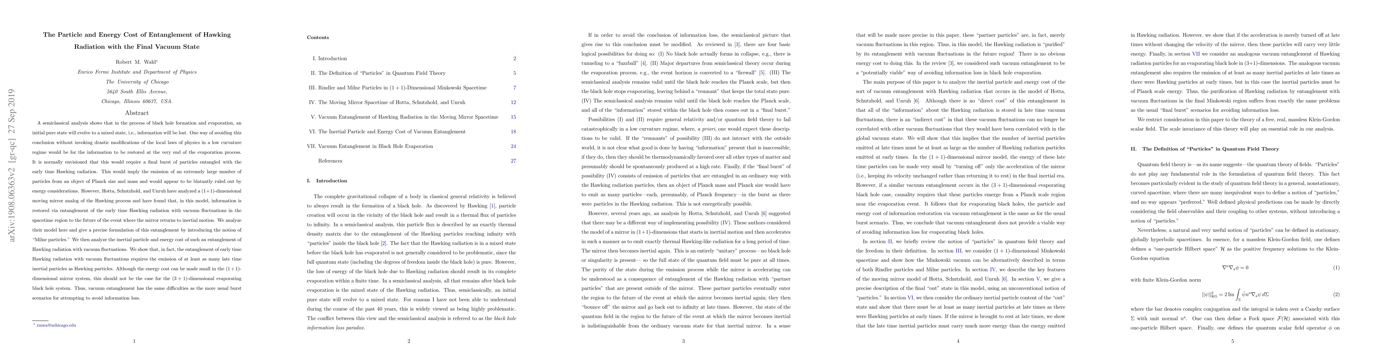 A semiclassical analysis shows that in the process of black hole formation and evaporation, an initial pure state will evolve to a mixed state, i.e., information will be lost. One way of avoiding this conclusion without invoking drastic modifications of the local laws of physics in a low curvature regime would be for the information to be restored at the very end of the evaporation process. It is normally envisioned that this would require a final burst of particles entangled with the early time Hawking radiation. This would imply the emission of an extremely large number of particles from an object of Planck size and mass and would appear to be blatantly ruled out by energy considerations. However, Hotta, Schutzhold, and Unruh have analyzed a $(1+1)$-dimensional moving mirror analog of the Hawking process and have found that, in this model, information is restored via entanglement of the early time Hawking radiation with vacuum fluctuations in the spacetime region to the future of the event where the mirror returns to inertial motion. We analyze their model here and give a precise formulation of this entanglement by introducing the notion of "Milne particles." We then analyze the inertial particle and energy cost of such an entanglement of Hawking radiation with vacuum fluctuations. We show that that, in fact, the entanglement of early time Hawking radiation with vacuum fluctuations requires the emission of at least as many late time inertial particles as Hawking particles. Although the energy cost can be made small in the $(1+1)$-dimensional mirror system, this should not be the case for the $(3+1)$-dimensional evaporating black hole system. Thus, vacuum entanglement has the same difficulties as the more usual burst scenarios for attempting to avoid information loss.