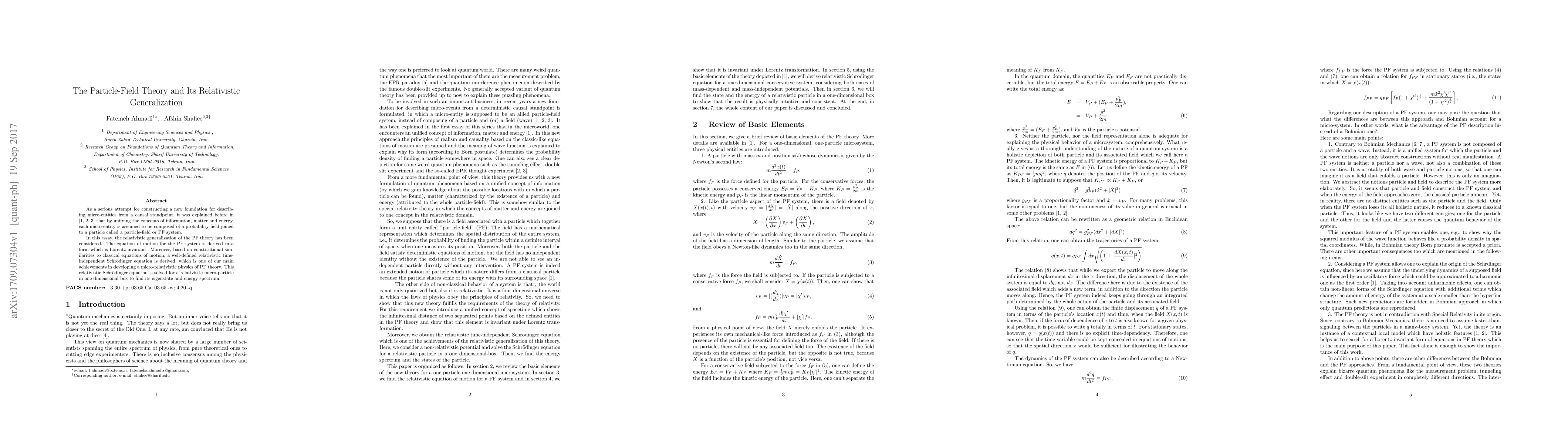 As a serious attempt for constructing a new foundation for describing micro-entities from a causal standpoint, it was explained before in [1, 2, 3] that by unifying the concepts of information, matter and energy, each micro-entity is assumed to be composed of a probability field joined to a particle called a particle-field or PF system. In this essay, the relativistic generalization of the PF theory has been considered. The equation of motion for the PF system is derived in a form which is Lorentz-invariant. Moreover, based on constitutional similarities to classical equations of motion, a well-defined relativistic time-independent Schrodinger equation is derived, which is one of our main achievements in developing a micro-relativistic physics of PF theory. This relativistic Schrodinger equation is solved for a relativistic micro-particle in one-dimensional box to find its eigenstate and energy spectrum.