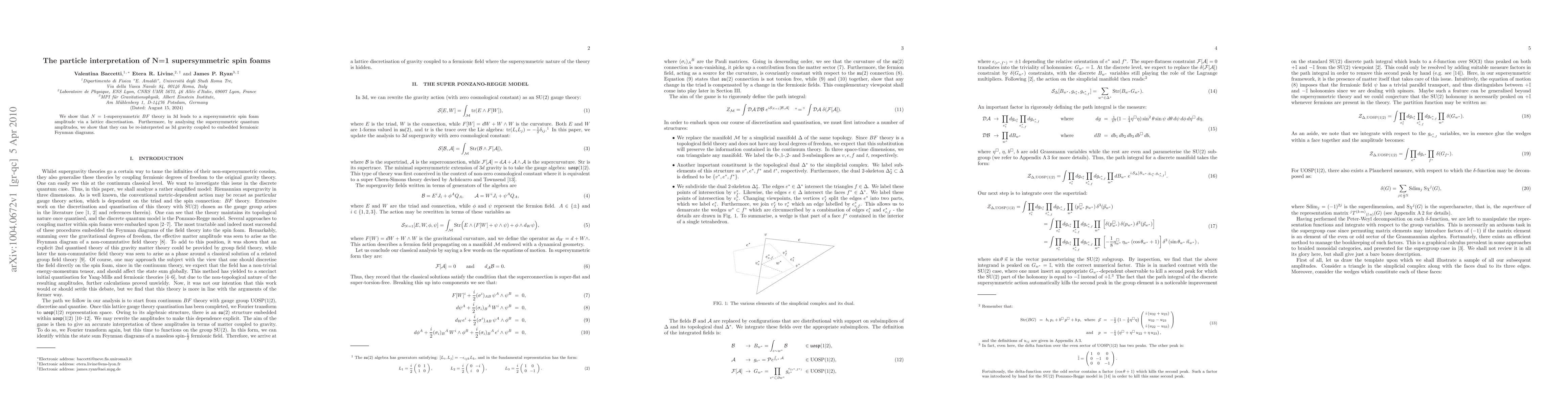Researchers show that supersymmetric BF theory in 3D leads to a spin foam amplitude through lattice discretization, which can be interpreted as 3D gravity coupled to fermionic Feynman diagrams.