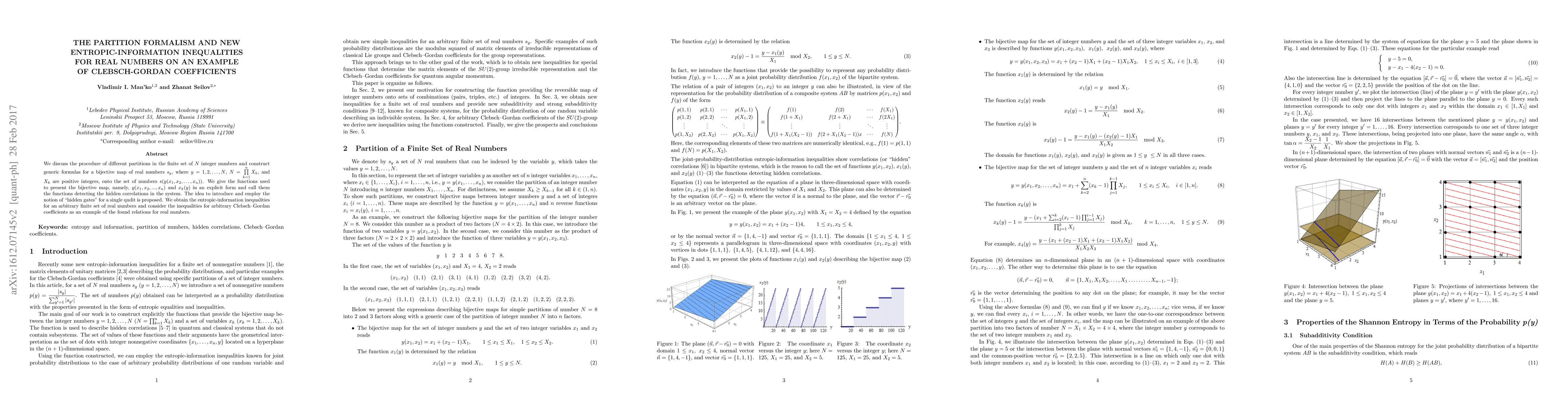 We discuss the procedure of different partitions in the finite set of $N$ integer numbers and construct generic formulas for a bijective map of real numbers $s_y$, where $y=1,2,\ldots,N$, $N=\prod \limits_{k=1}^{n} X_k$, and $X_k$ are positive integers, onto the set of numbers $s(y(x_1,x_2,\ldots,x_n))$. We give the functions used to present the bijective map, namely, $y(x_1,x_2,...,x_n)$ and $x_k(y)$ in an explicit form and call them the functions detecting the hidden correlations in the system. The idea to introduce and employ the notion of "hidden gates" for a single qudit is proposed. We obtain the entropic-information inequalities for an arbitrary finite set of real numbers and consider the inequalities for arbitrary Clebsch--Gordan coefficients as an example of the found relations for real numbers.