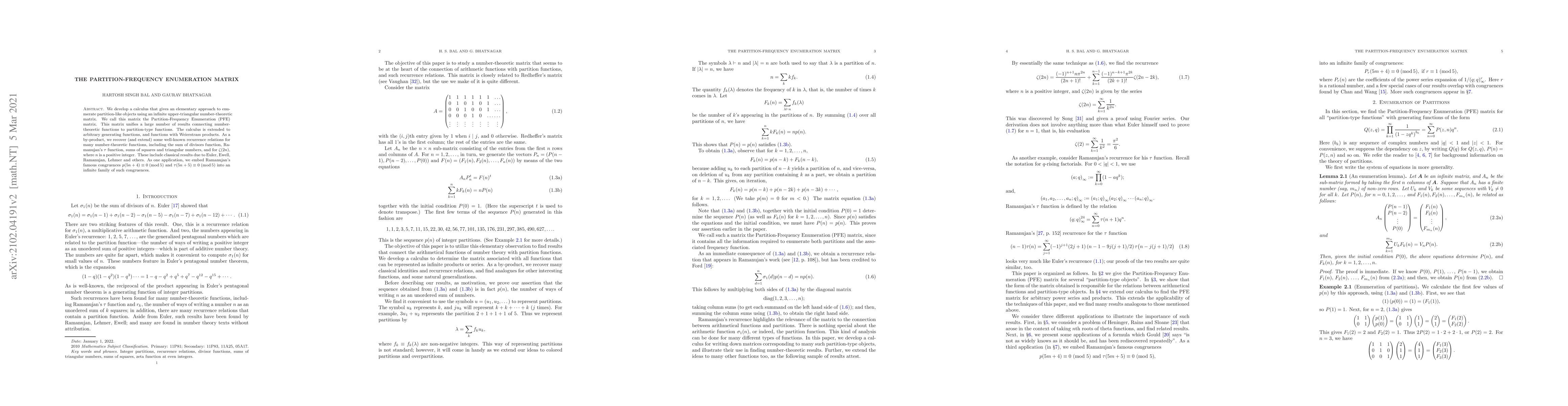 This paper introduces the Partition-Frequency Enumeration (PFE) matrix, a tool that unifies various results connecting number-theoretic functions to partition-like objects. It extends the calculus to arbitrary generating functions and Weierstrass products, recovering and extending known recurrence relations for functions like the sum of divisors, Ramanujan's au function, sums of squares, triangular numbers, and zeta(2n). The method also generates an infinite family of Ramanujan's congruences.