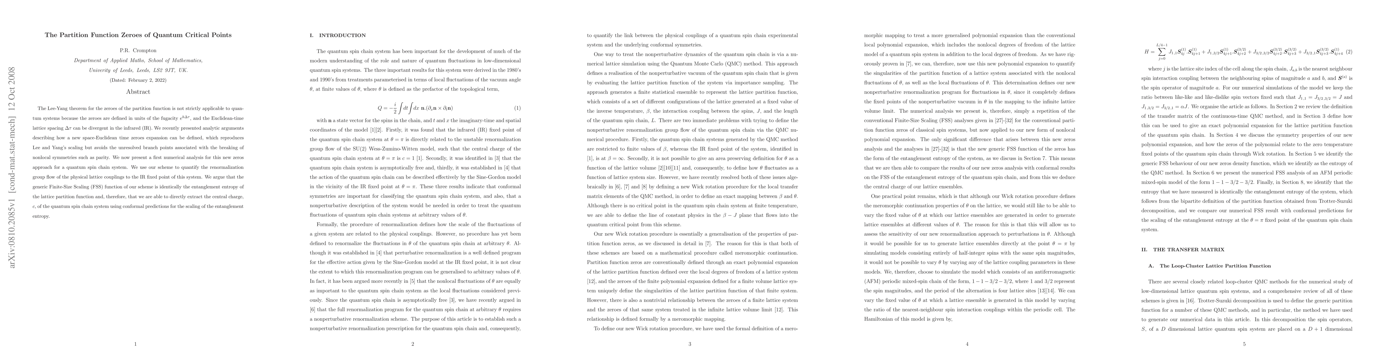 The Lee-Yang theorem for the zeroes of the partition function is not strictly applicable to quantum systems because the zeroes are defined in units of the fugacity $e^{h\Delta\tau}$, and the Euclidean-time lattice spacing $\Delta\tau$ can be divergent in the infrared (IR). We recently presented analytic arguments describing how a new space-Euclidean time zeroes expansion can be defined, which reproduces Lee and Yang's scaling but avoids the unresolved branch points associated with the breaking of nonlocal symmetries such as parity. We now present a first numerical analysis for this new zeros approach for a quantum spin chain system. We use our scheme to quantify the renormalization group flow of the physical lattice couplings to the IR fixed point of this system. We argue that the generic Finite-Size Scaling (FSS) function of our scheme is identically the entanglement entropy of the lattice partition function and, therefore, that we are able to directly extract the central charge, $c$, of the quantum spin chain system using conformal predictions for the scaling of the entanglement entropy.