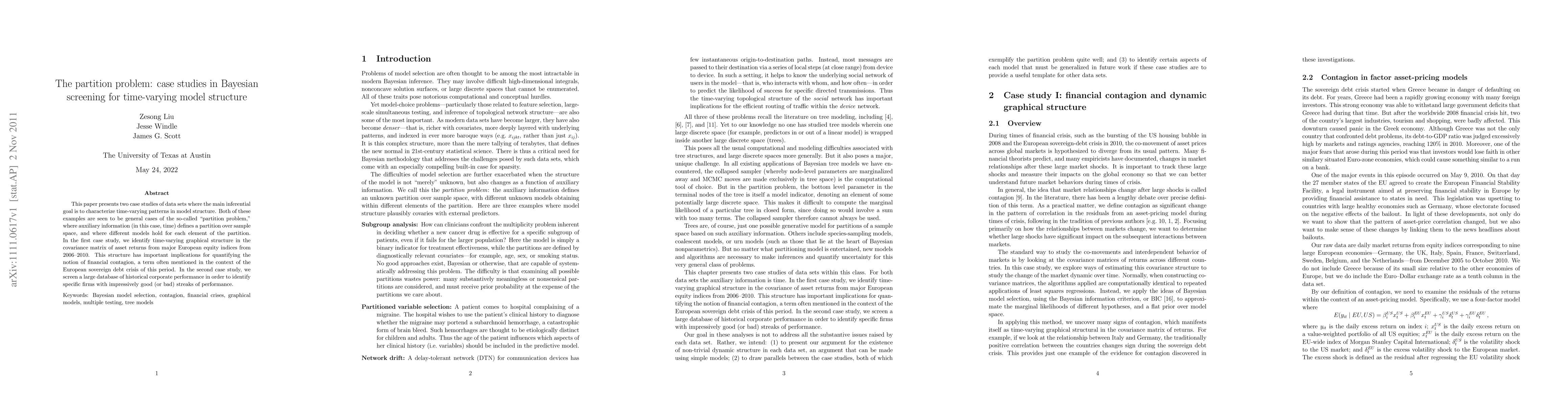 This paper presents two case studies of data sets where the main inferential goal is to characterize time-varying patterns in model structure. Both of these examples are seen to be general cases of the so-called "partition problem," where auxiliary information (in this case, time) defines a partition over sample space, and where different models hold for each element of the partition. In the first case study, we identify time-varying graphical structure in the covariance matrix of asset returns from major European equity indices from 2006--2010. This structure has important implications for quantifying the notion of financial contagion, a term often mentioned in the context of the European sovereign debt crisis of this period. In the second case study, we screen a large database of historical corporate performance in order to identify specific firms with impressively good (or bad) streaks of performance.