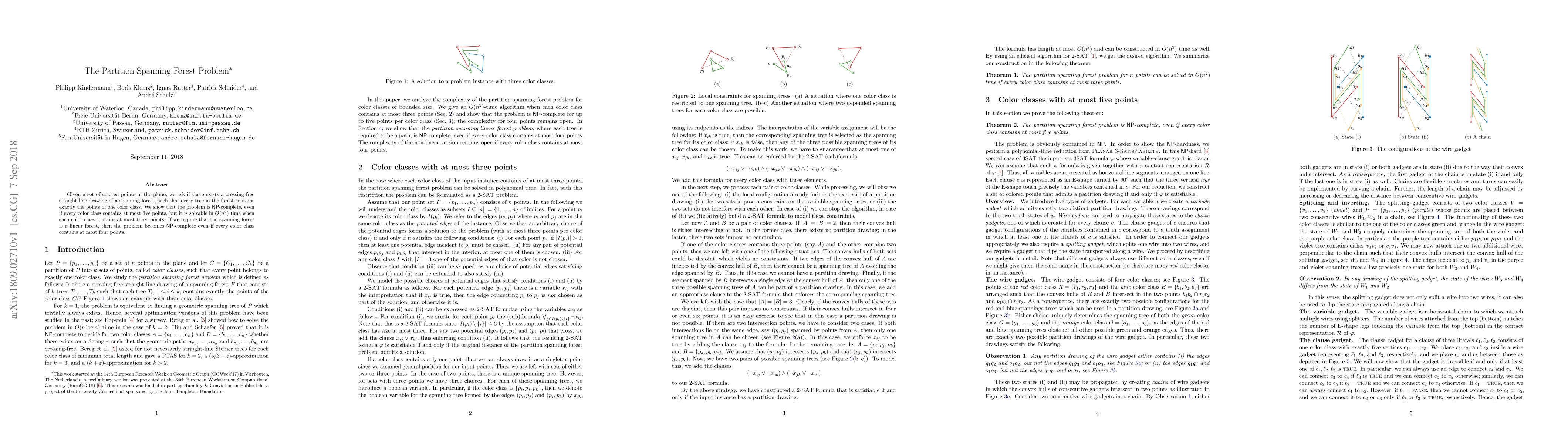 The Partition Spanning Forest Problem asks if a set of colored points can be connected with a crossing-free spanning forest, where each tree corresponds to a single color class. The problem is NP-complete for certain constraints but can be solved in quadratic time for others.