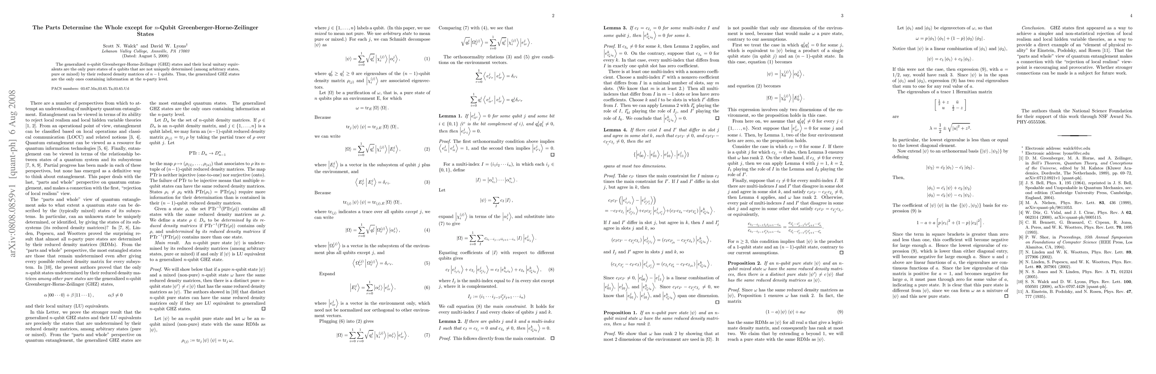 Summary: The paper discusses that generalized n-qubit Greenberger-Horne-Zeilinger (GHZ) states are unique pure states not determined by their reduced density matrices, indicating they hold n-party level information, unlike other qubit states.