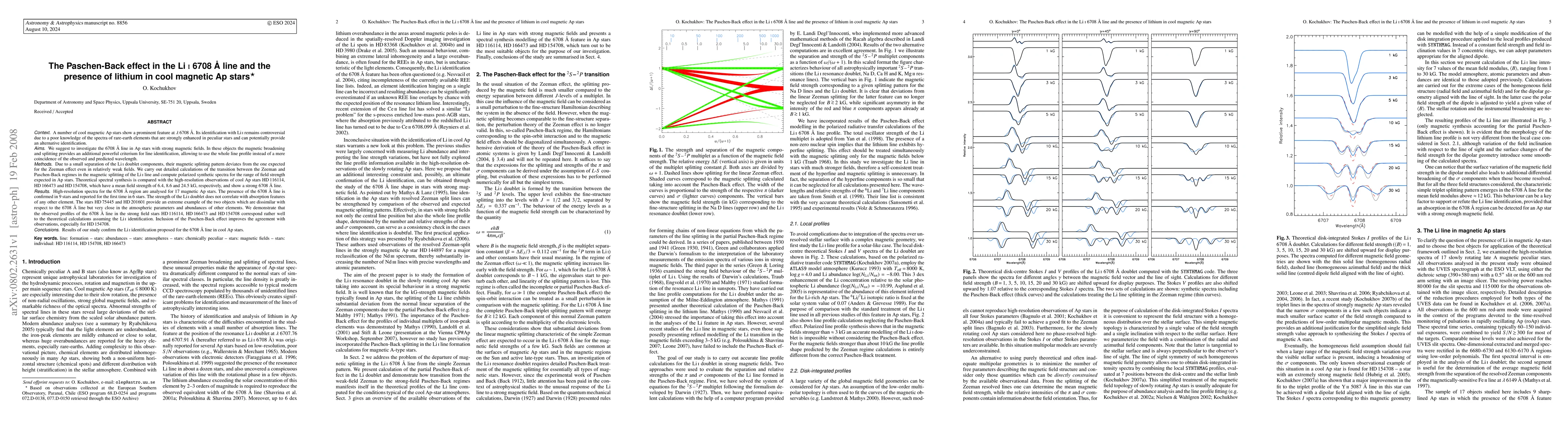 This paper investigates the 6708 Å line in cool magnetic Ap stars, confirming its identification with Li I through detailed calculations of the Paschen-Back effect and comparison with high-resolution observations, which show strong magnetic broadening and splitting patterns. The study supports Li I as the source of the 6708 Å line in these stars.