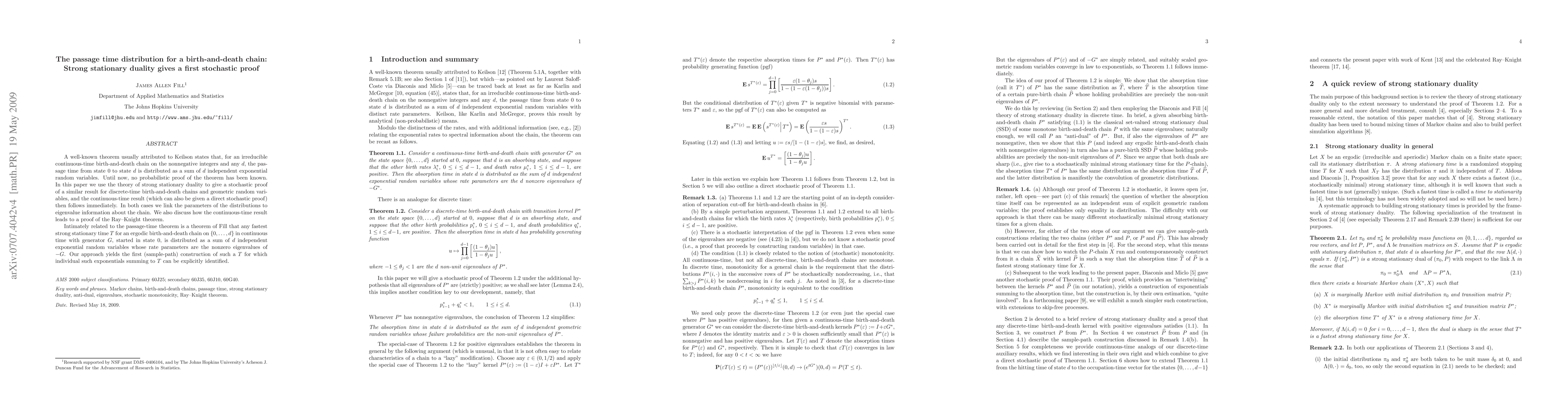 This paper provides a stochastic proof for the passage time distribution in birth-and-death chains using strong stationary duality, leading to new insights into continuous-time and discrete-time results.