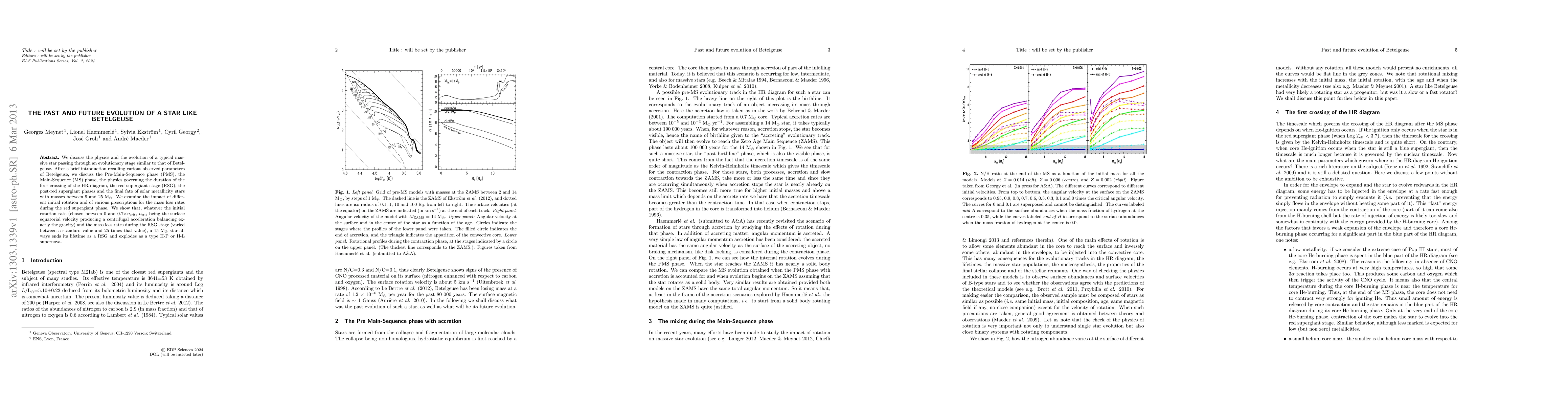 We discuss the physics and the evolution of a typical massive star passing through an evolutionary stage similar to that of Betelgeuse. After a brief introduction recalling various observed parameters of Betelgeuse, we discuss the Pre-Main-Sequence phase (PMS), the Main-Sequence (MS) phase, the physics governing the duration of the first crossing of the HR diagram, the red supergiant stage (RSG), the post-red supergiant phases and the final fate of solar metallicity stars with masses between 9 and 25 M$_\odot$. We examine the impact of different initial rotation and of various prescriptions for the mass loss rates during the red supergiant phase. We show that, whatever the initial rotation rate (chosen between 0 and 0.7$\times\upsilon_{\rm crit}$, $\upsilon_{\rm crit}$ being the surface equatorial velocity producing a centrifugal acceleration balancing exactly the gravity) and the mass loss rates during the RSG stage (varied between a standard value and 25 times that value), a 15 M$_\odot$ star always ends its lifetime as a RSG and explodes as a type II-P or II-L supernova.