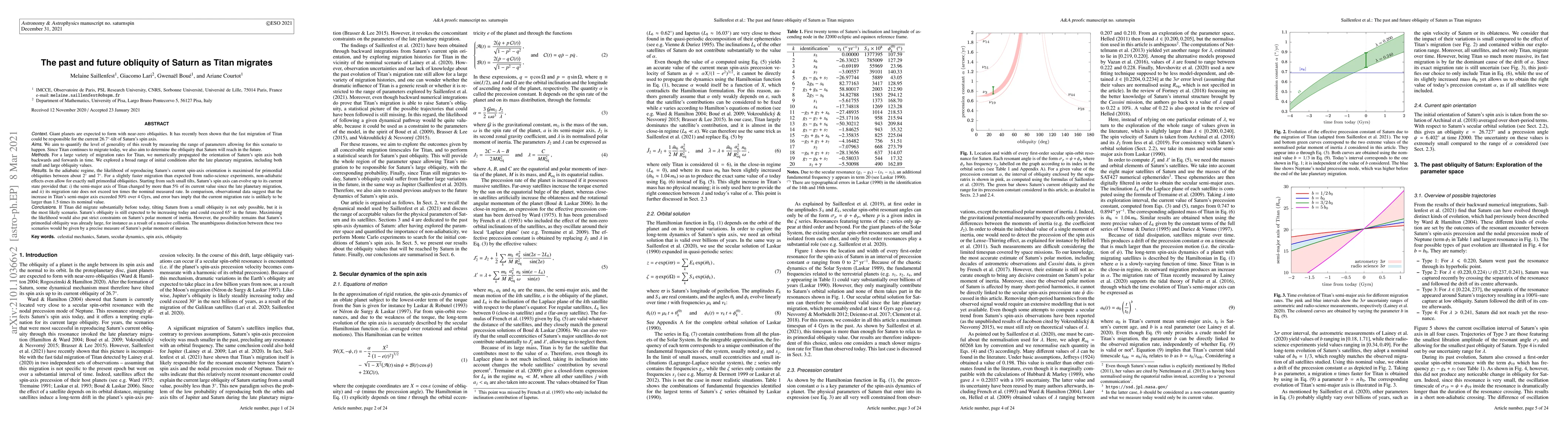 Aims: It has recently been shown that the fast migration of Titan could be responsible for the current 26.7{\deg}-tilt of Saturn's spin axis. We aim to quantify the level of generality of this result and to measure the most likely sets of parameters. We also aim to determine the obliquity that Saturn will reach in the future. Methods: We explore a broad range of parameters and propagate numerically the orientation of Saturn's spin axis both backward and forward in time. Results: In the adiabatic regime, the likelihood of reproducing Saturn's current spin-axis orientation is maximised for primordial obliquities between about 2{\deg} and 7{\deg}. For a slightly faster migration than expected from radio-science experiments, non-adiabatic effects even allow for exactly null primordial obliquities. Starting from such small tilts, Saturn's spin axis can evolve up to its current state provided that: i) the semi-major axis of Titan changed by more than 5% of its current value, and ii) its migration rate does not exceed 10 times the nominal measured rate. In comparison, observational data suggest that the increase of Titan's semi-major axis exceeded 50% over 4 Gyrs, and error bars imply that the current migration rate is unlikely to be larger than 1.5 times its nominal value. Conclusions: If Titan did migrate substantially before today, tilting Saturn from a small obliquity is not only possible, but it is the most likely scenario. Saturn's obliquity is expected to be still increasing today and could exceed 65{\deg} in the future. Maximising the likelihood would also put strict constraints on Saturn's polar moment of inertia. However, the possibility remains that Saturn's primordial obliquity was already large, for instance as a result of a massive collision. The unambiguous distinction between these two scenarios would be given by a precise measure of Saturn's polar moment of inertia.