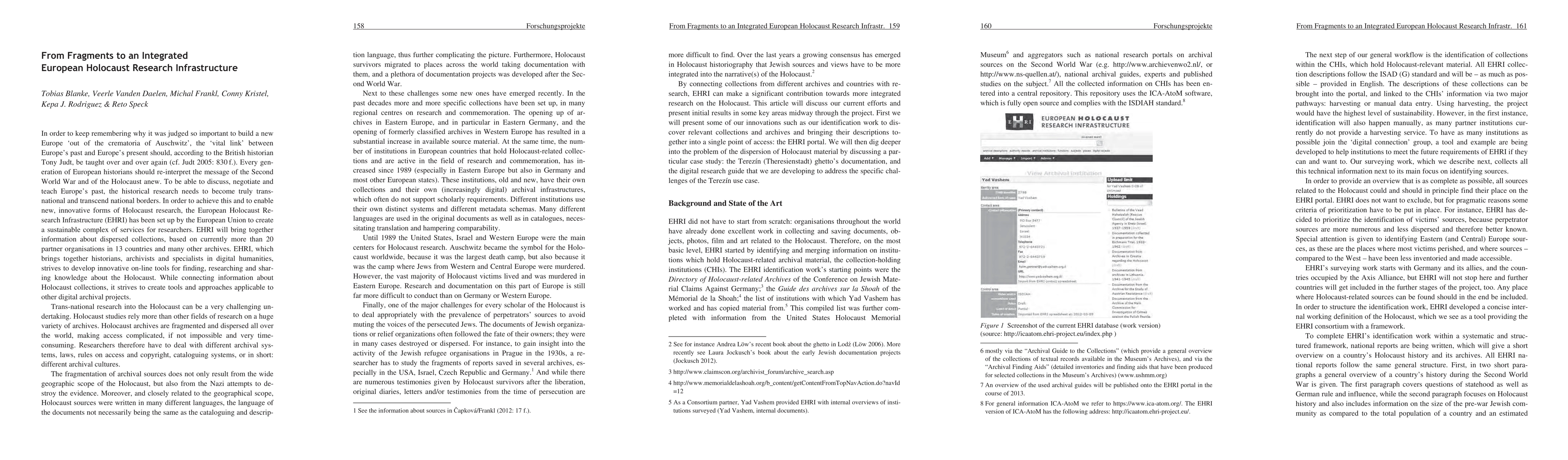 The European Holocaust Research Infrastructure (EHRI) has been established by the EU to integrate dispersed Holocaust-related collections from over 20 partner organizations across 13 countries. EHRI aims to develop innovative digital tools for researchers, fostering collaboration among historians, archivists, and digital humanities specialists, with the goal of creating a sustainable, accessible infrastructure applicable to other digital archival projects.