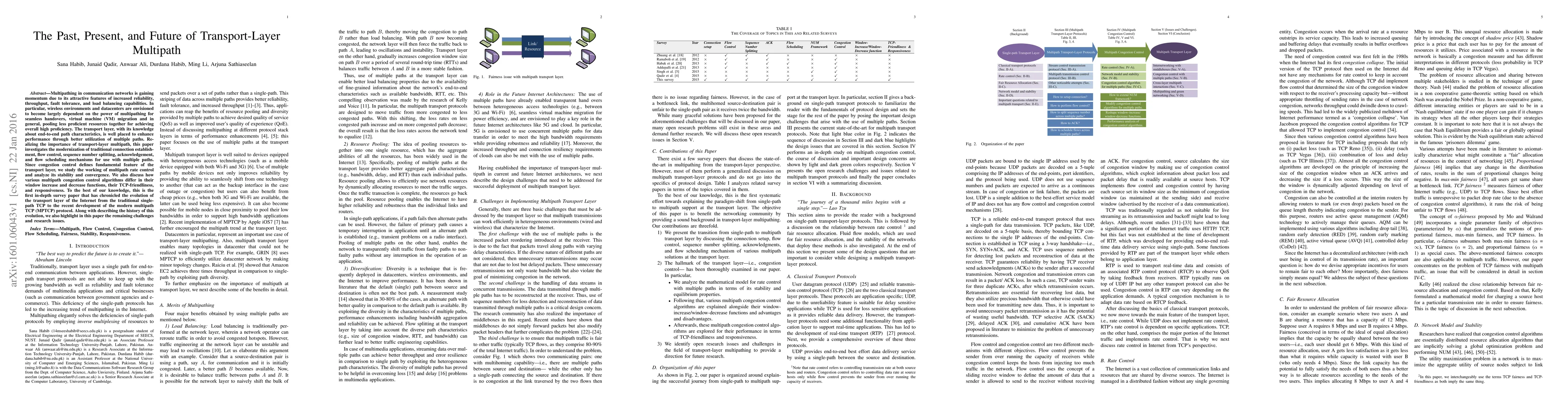 Multipathing in communication networks is gaining momentum due to its attractive features of increased reliability, throughput, fault tolerance, and load balancing capabilities. In particular, wireless environments and datacenters are envisioned to become largely dependent on the power of multipathing for seamless handovers, virtual machine (VM) migration and in general, pooling less proficient resources together for achieving overall high proficiency. The transport layer, with its knowledge about end-to-end path characteristics, is well placed to enhance performance through better utilization of multiple paths. Realizing the importance of transport-layer multipath, this paper investigates the modernization of traditional connection establishment, flow control, sequence number splitting, acknowledgement, and flow scheduling mechanisms for use with multiple paths. Since congestion control defines a fundamental feature of the transport layer, we study the working of multipath rate control and analyze its stability and convergence. We also discuss how various multipath congestion control algorithms differ in their window increase and decrease functions, their TCP-friendliness, and responsiveness. To the best of our knowledge, this is the first in-depth survey paper that has chronicled the evolution of the transport layer of the Internet from the traditional single-path TCP to the recent development of the modern multipath TCP (MPTCP) protocol. Along with describing the history of this evolution, we also highlight in this paper the remaining challenges and research issues.