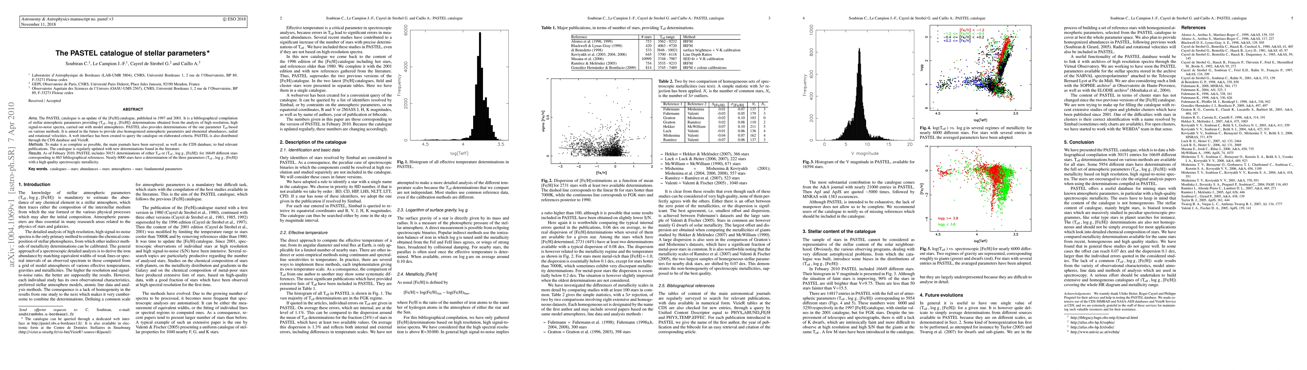 The PASTEL catalogue is an update of the [Fe/H] catalogue, published in 1997 and 2001. It is a bibliographical compilation of stellar atmospheric parameters providing (Teff,logg,[Fe/H]) determinations obtained from the analysis of high resolution, high signal-to-noise spectra, carried out with model atmospheres. PASTEL also provides determinations of the one parameter Teff based on various methods. It is aimed in the future to provide also homogenized atmospheric parameters and elemental abundances, radial and rotational velocities. A web interface has been created to query the catalogue on elaborated criteria. PASTEL is also distributed through the CDS database and VizieR. To make it as complete as possible, the main journals have been surveyed, as well as the CDS database, to find relevant publications. The catalogue is regularly updated with new determinations found in the literature. As of Febuary 2010, PASTEL includes 30151 determinations of either Teff or (Teff,logg,[Fe/H]) for 16649 different stars corresponding to 865 bibliographical references. Nearly 6000 stars have a determination of the three parameters (Teff,logg,[Fe/H]) with a high quality spectroscopic metallicity.