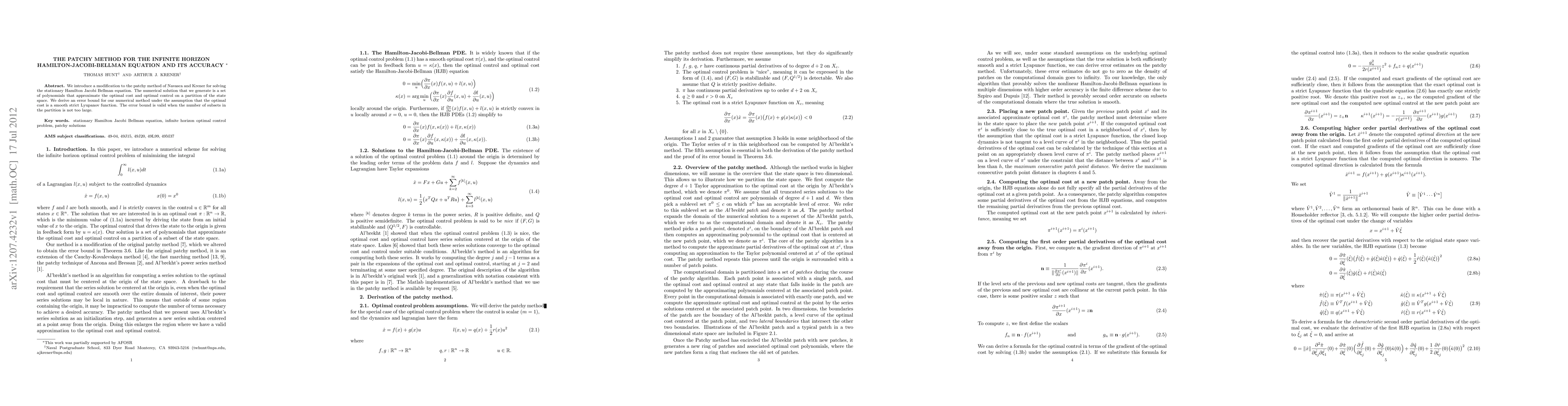 We introduce a modification to the patchy method of Navasca and Krener for solving the stationary Hamilton Jacobi Bellman equation. The numerical solution that we generate is a set of polynomials that approximate the optimal cost and optimal control on a partition of the state space. We derive an error bound for our numerical method under the assumption that the optimal cost is a smooth strict Lyupanov function. The error bound is valid when the number of subsets in the partition is not too large.