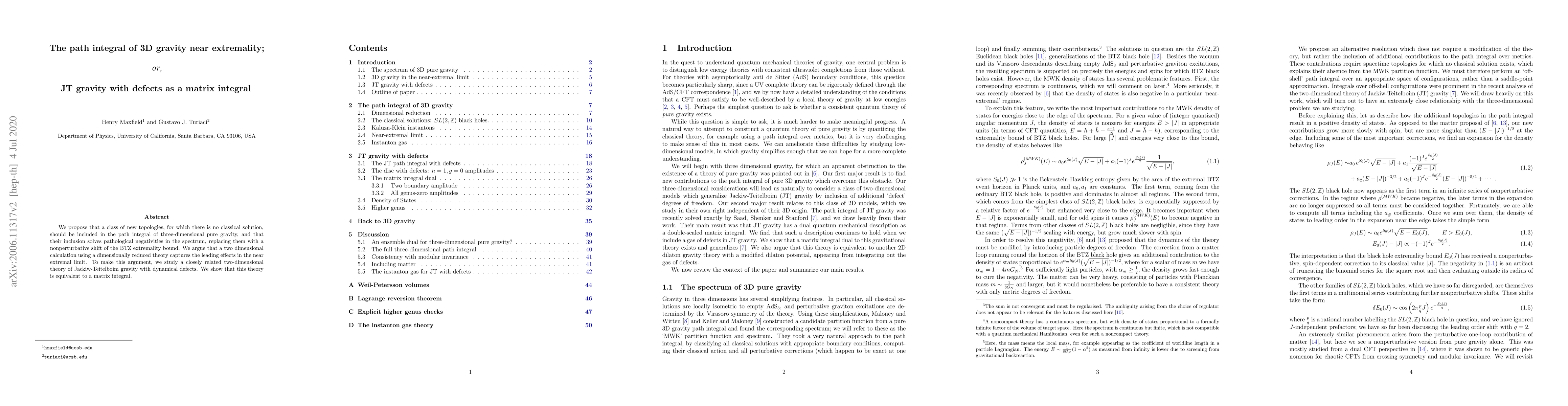 We propose that a class of new topologies, for which there is no classical solution, should be included in the path integral of three-dimensional pure gravity, and that their inclusion solves pathological negativities in the spectrum, replacing them with a nonperturbative shift of the BTZ extremality bound. We argue that a two-dimensional calculation using a dimensionally reduced theory captures the leading effects in the near extremal limit. To make this argument, we study a closely related two-dimensional theory of Jackiw-Teitelboim gravity with dynamical defects. We show that this theory is equivalent to a matrix integral.