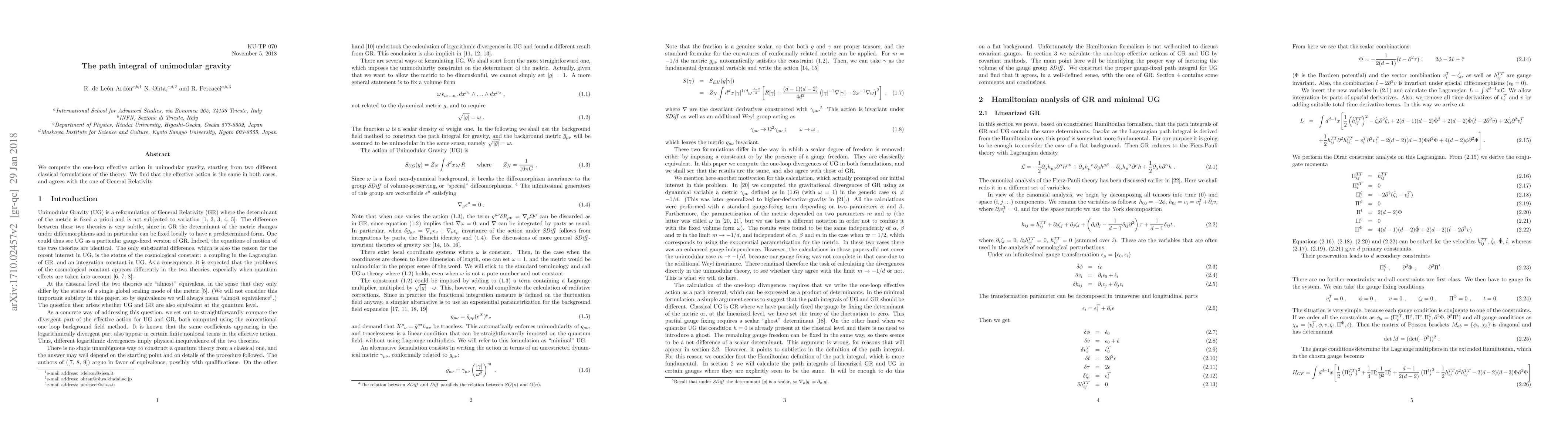 We compute the one-loop effective action in unimodular gravity, starting from two different classical formulations of the theory. We find that the effective action is the same in both cases, and agrees with the one of General Relativity.
