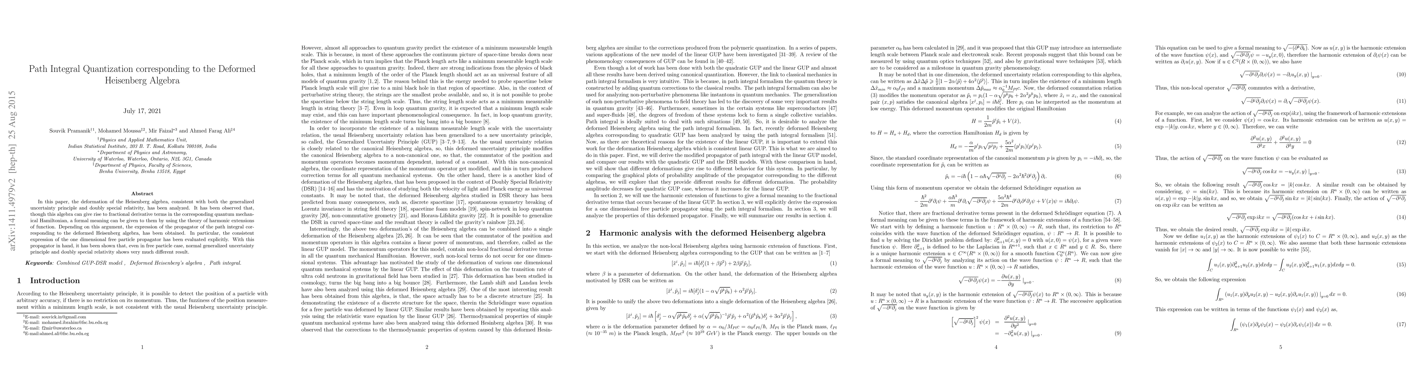 In this paper, the deformation of the Heisenberg algebra, consistent with both the generalized uncertainty principle and doubly special relativity, has been analyzed. It has been observed that, though this algebra can give rise to fractional derivative terms in the corresponding quantum mechanical Hamiltonian, a formal meaning can be given to them by using the theory of harmonic extensions of function. Depending on this argument, the expression of the propagator of the path integral corresponding to the deformed Heisenberg algebra, has been obtained. In particular, the consistent expression of the one dimensional free particle propagator has been evaluated explicitly. With this propagator in hand, it has been shown that, even in free particle case, normal generalized uncertainty principle and doubly special relativity shows very much different result.
