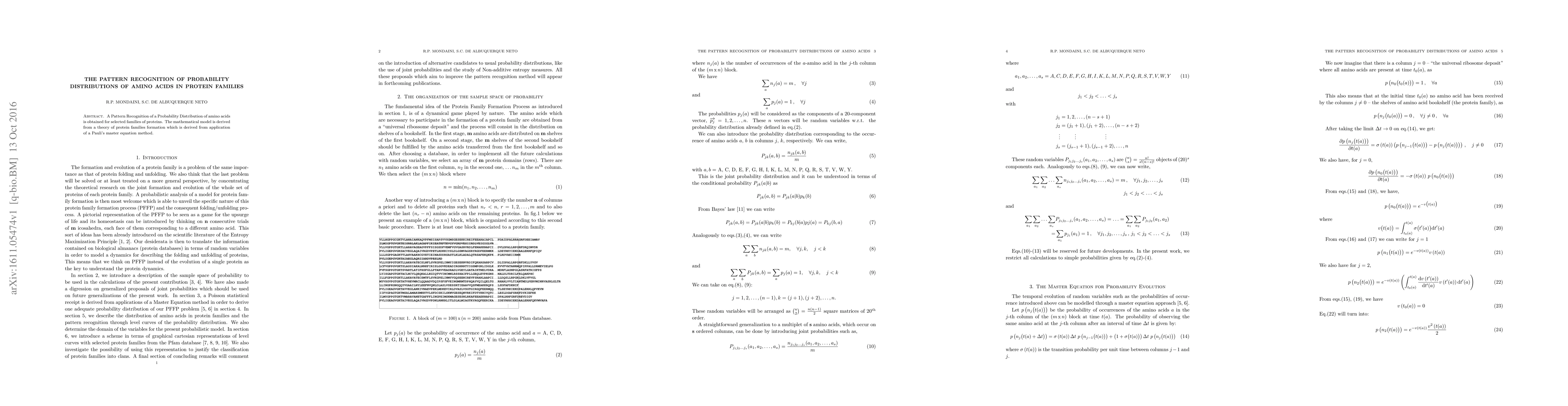 A pattern Recognition of a probability distribution of amino acids is obtained for selected families of proteins. The mathematical model is derived from a theory of protein families formation which is derived from application of a Pauli's master equation method.