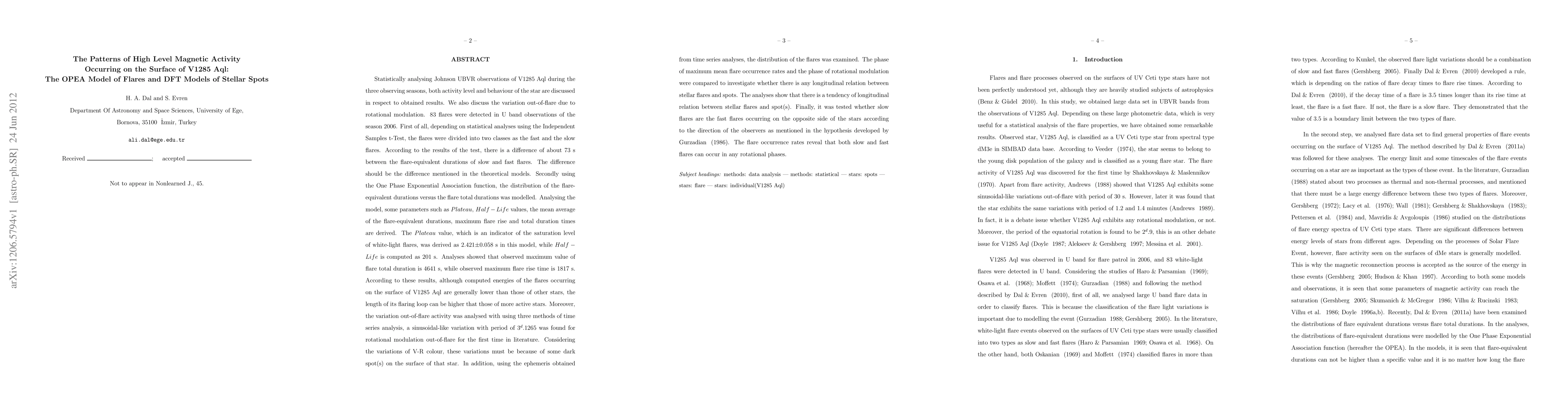 Statistically analyzing Johnson UBVR observations of V1285 Aql during the three observing seasons, both activity level and behavior of the star are discussed in respect to obtained results. We also discuss the out-of-flare variation due to rotational modulation. Eighty-three flares were detected in the U-band observations of season 2006 . First, depending on statistical analyses using the independent samples t-test, the flares were divided into two classes as the fast and the slow flares. According to the results of the test, there is a difference of about 73 s between the flare-equivalent durations of slow and fast flares. The difference should be the difference mentioned in the theoretical models. Second, using the one-phase exponential association function, the distribution of the flare-equivalent durations versus the flare total durations was modeled. Analyzing the model, some parameters such as plateau, half-life values, mean average of the flare-equivalent durations, maximum flare rise, and total duration times are derived. The plateau value, which is an indicator of the saturation level of white-light flares, was derived as 2.421{\pm}0.058 s in this model, while half-life is computed as 201 s. Analyses showed that observed maximum value of flare total duration is 4641 s, while observed maximum flare rise time is 1817 s. According to these results, although computed energies of the flares occurring on the surface of V1285 Aql are generally lower than those of other stars, the length of its flaring loop can be higher than those of more active stars.