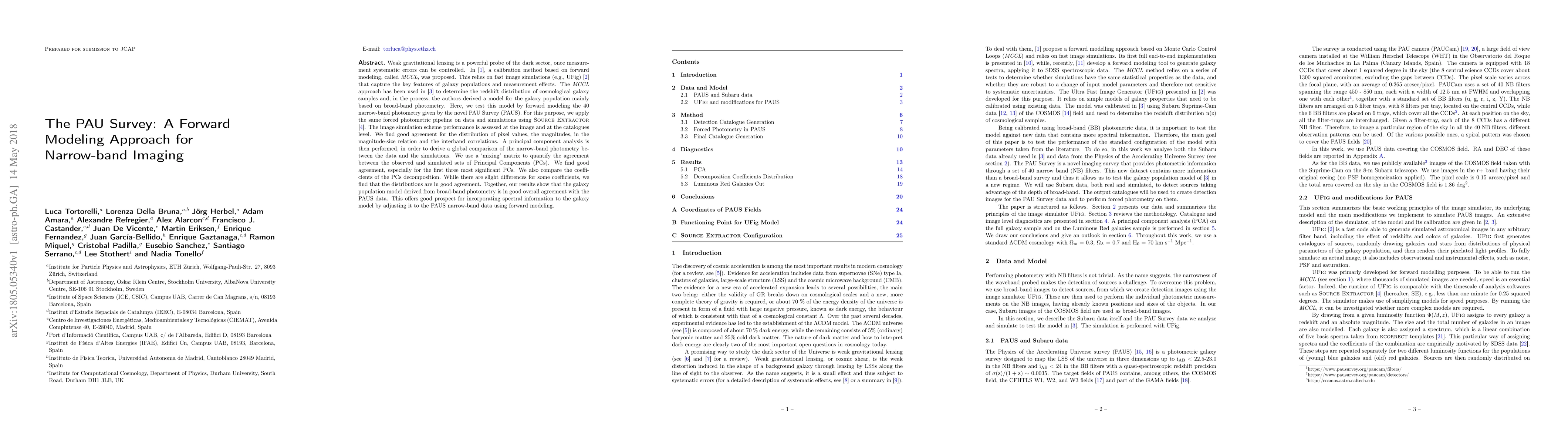Weak gravitational lensing is a powerful probe of the dark sector, once measurement systematic errors can be controlled. In Refregier & Amara (2014), a calibration method based on forward modeling, called MCCL, was proposed. This relies on fast image simulations (e.g., UFig; Berge et al. 2013) that capture the key features of galaxy populations and measurement effects. The MCCL approach has been used in Herbel et al. (2017) to determine the redshift distribution of cosmological galaxy samples and, in the process, the authors derived a model for the galaxy population mainly based on broad-band photometry. Here, we test this model by forward modeling the 40 narrow-band photometry given by the novel PAU Survey (PAUS). For this purpose, we apply the same forced photometric pipeline on data and simulations using Source Extractor (Bertin & Arnouts 1996). The image simulation scheme performance is assessed at the image and at the catalogues level. We find good agreement for the distribution of pixel values, the magnitudes, in the magnitude-size relation and the interband correlations. A principal component analysis is then performed, in order to derive a global comparison of the narrow-band photometry between the data and the simulations. We use a `mixing' matrix to quantify the agreement between the observed and simulated sets of Principal Components (PCs). We find good agreement, especially for the first three most significant PCs. We also compare the coefficients of the PCs decomposition. While there are slight differences for some coefficients, we find that the distributions are in good agreement. Together, our results show that the galaxy population model derived from broad-band photometry is in good overall agreement with the PAUS data. This offers good prospect for incorporating spectral information to the galaxy model by adjusting it to the PAUS narrow-band data using forward modeling.