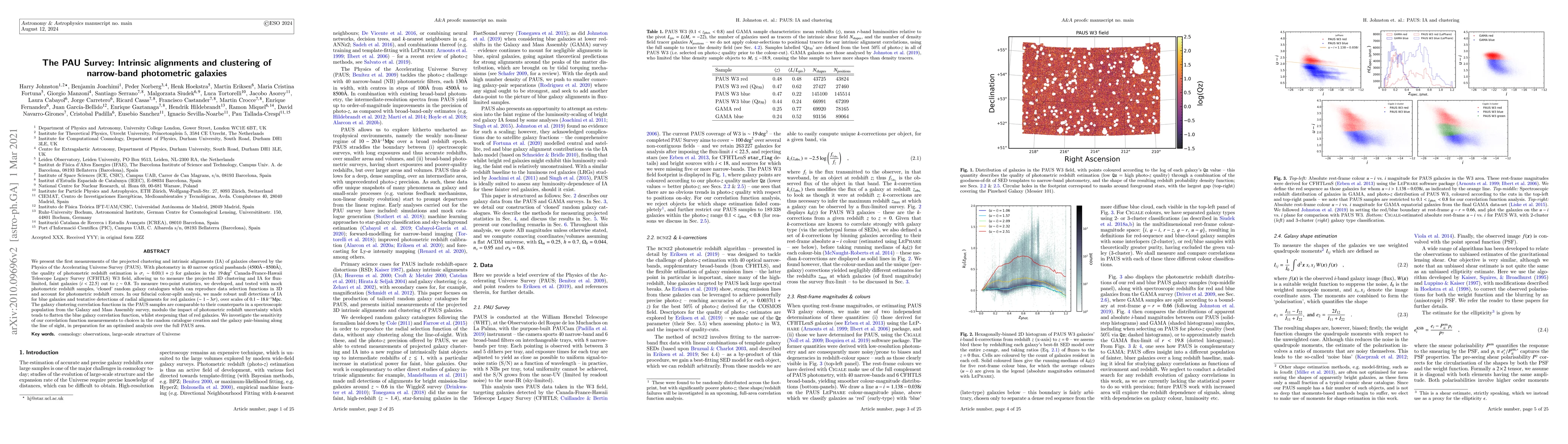 The PAU Survey measures the projected clustering and intrinsic alignments of narrow-band photometric galaxies, finding tentative radial alignments in red galaxies and null detections in blue galaxies. The study uses a novel method to account for photometric redshift errors and compares clustering results with spectroscopic data.