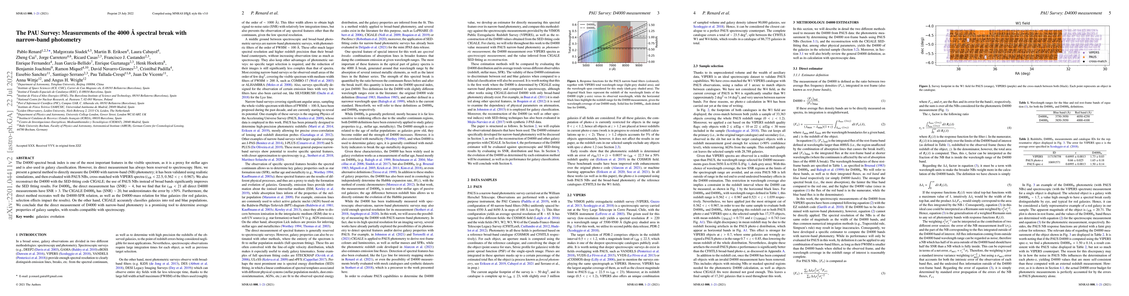 The PAU Survey introduces a novel method to directly measure the D4000 spectral break index using narrow-band photometry, validated through simulations and real data, showing comparable results to spectroscopy. The direct method provides reliable measurements for galaxies with $i_{\rm AB}<21$, while SED-fitting with CIGALE offers accurate classification but underestimates error.