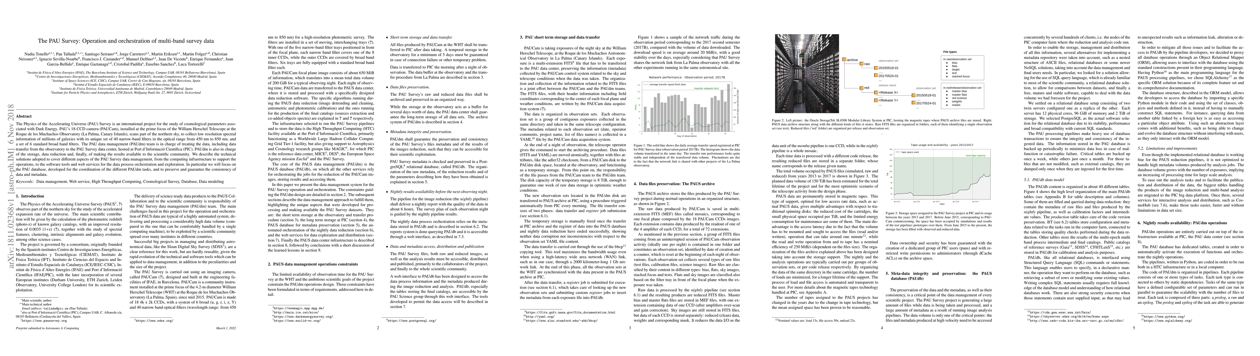 The PAU Survey utilizes a 18-CCD camera with 40 narrow-band filters to collect spectral data of galaxies, aiming to study Dark Energy. The PAUdm team manages data transfer, reduction, and storage, employing a specialized database for task coordination and data consistency.
