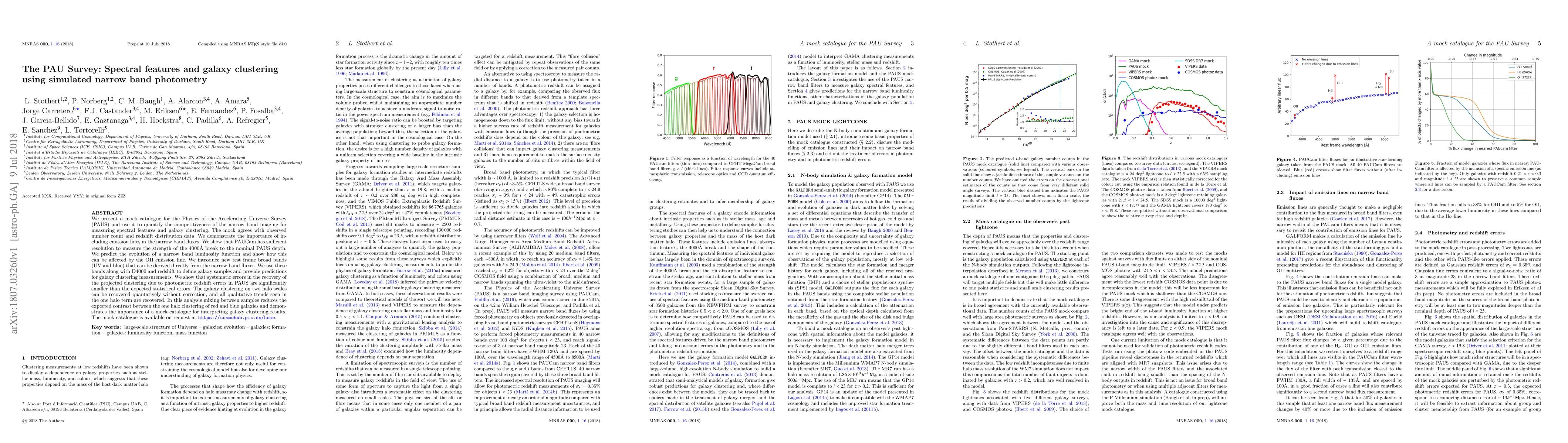 The PAU Survey mock catalogue demonstrates the effectiveness of narrow band imaging for measuring spectral features and galaxy clustering, showing that PAUCam's resolution is adequate for the 4000Å break and predicting the impact of OII emission lines on narrow band luminosity functions. The study highlights the importance of systematic error management in galaxy clustering measurements and provides a tool for interpreting clustering results.