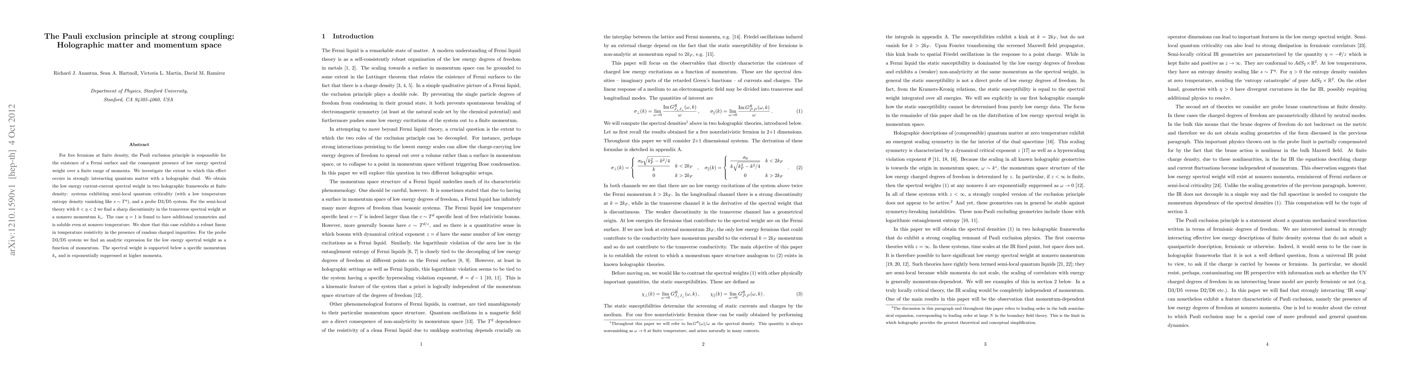 For free fermions at finite density, the Pauli exclusion principle is responsible for the existence of a Fermi surface and the consequent presence of low energy spectral weight over a finite range of momenta. We investigate the extent to which this effect occurs in strongly interacting quantum matter with a holographic dual. We obtain the low energy current-current spectral weight in two holographic frameworks at finite density: systems exhibiting semi-local quantum criticality (with a low temperature entropy density vanishing like s ~ T^eta), and a probe D3/D5 system. For the semi-local theory with 0 < eta < 2 we find a sharp discontinuity in the transverse spectral weight at a nonzero momentum k_*. The case eta = 1 is found to have additional symmetries and is soluble even at nonzero temperature. We show that this case exhibits a robust linear in temperature resistivity in the presence of random charged impurities. For the probe D3/D5 system we find an analytic expression for the low energy spectral weight as a function of momentum. The spectral weight is supported below a specific momentum k_* and is exponentially suppressed at higher momenta.