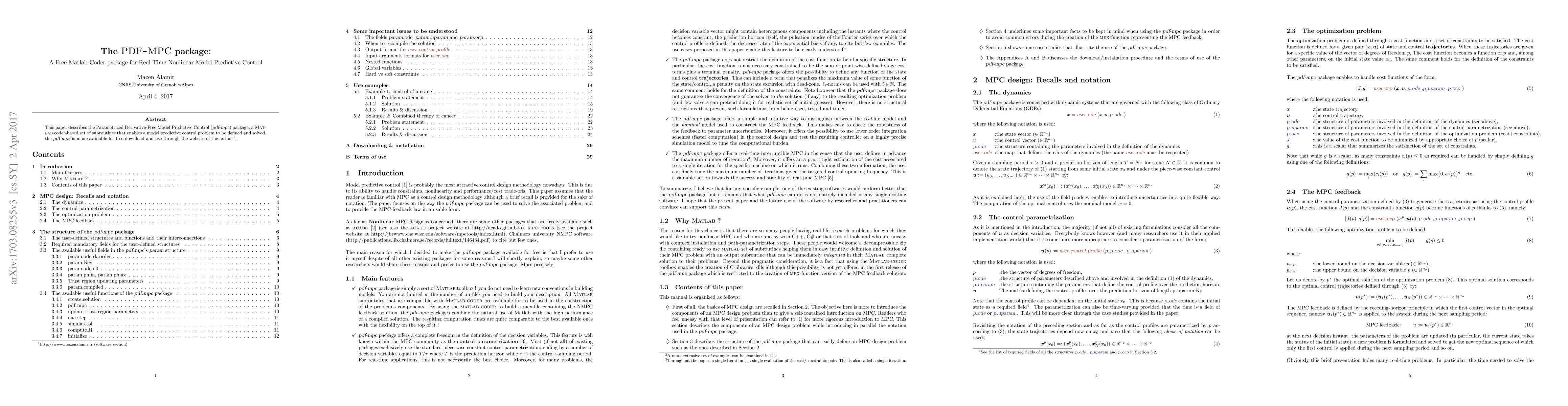 The paper describes the pdf-mpc package, a Matlab coder-based set of subroutines for defining and solving a model predictive control problem in real-time for nonlinear systems.