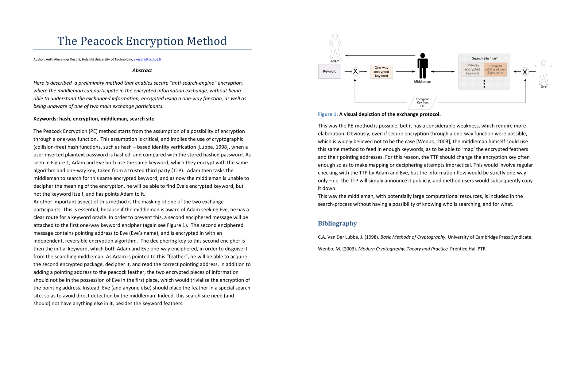 Here is described a preliminary method that enables secure 'anti-search-engine' encryption, where the middleman can participate in the encrypted information exchange, without being able to understand the exchanged information, encrypted using a one-way function, as well as being unaware of one of two main exchange participants.