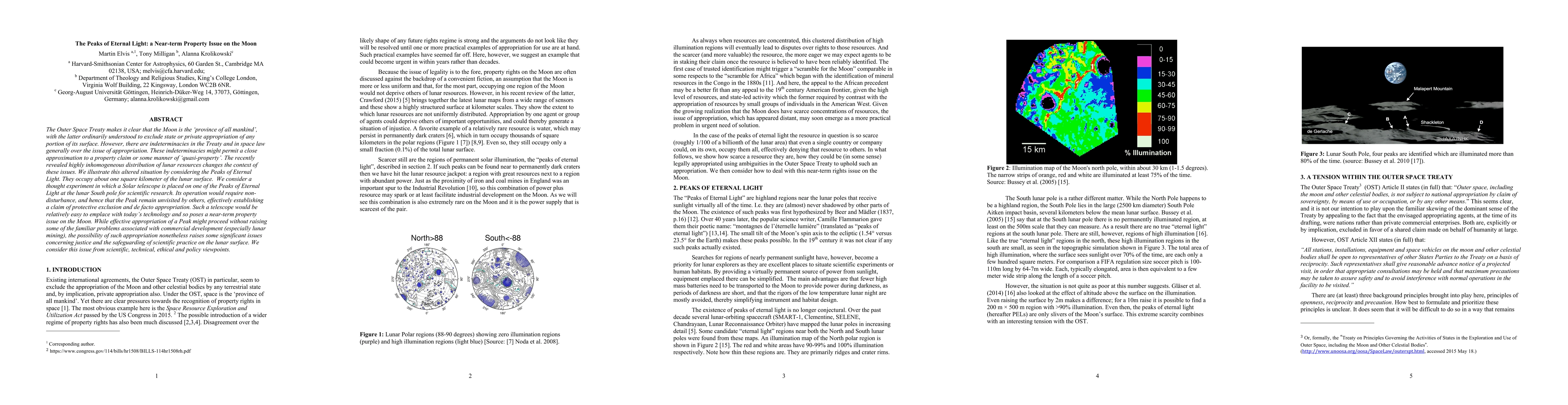 The Outer Space Treaty makes it clear that the Moon is the province of all mankind, with the latter ordinarily understood to exclude state or private appropriation of any portion of its surface. However, there are indeterminacies in the Treaty and in space law generally over the issue of appropriation. These indeterminacies might permit a close approximation to a property claim or some manner of quasi-property. The recently revealed highly inhomogeneous distribution of lunar resources changes the context of these issues. We illustrate this altered situation by considering the Peaks of Eternal Light. They occupy about one square kilometer of the lunar surface. We consider a thought experiment in which a Solar telescope is placed on one of the Peaks of Eternal Light at the lunar South pole for scientific research. Its operation would require nondisturbance, and hence that the Peak remain unvisited by others, effectively establishing a claim of protective exclusion and de facto appropriation. Such a telescope would be relatively easy to emplace with todays technology and so poses a near-term property issue on the Moon. While effective appropriation of a Peak might proceed without raising some of the familiar problems associated with commercial development (especially lunar mining), the possibility of such appropriation nonetheless raises some significant issues concerning justice and the safeguarding of scientific practice on the lunar surface. We consider this issue from scientific, technical, ethical and policy viewpoints.