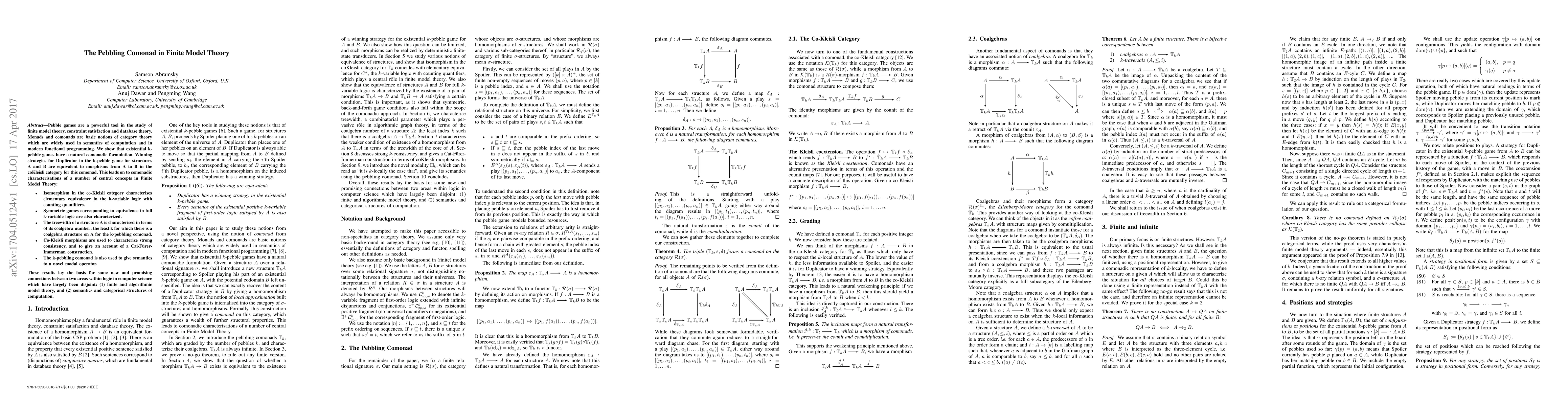 This paper establishes a comonadic framework for existential k-pebble games in finite model theory, showing that winning strategies in these games correspond to morphisms in the coKleisli category. It uses the k-pebbling comonad to characterize key concepts in finite model theory, including isomorphism, equivalence, treewidth, and strong consistency, thereby bridging connections between finite model theory and categorical semantics in computation.
