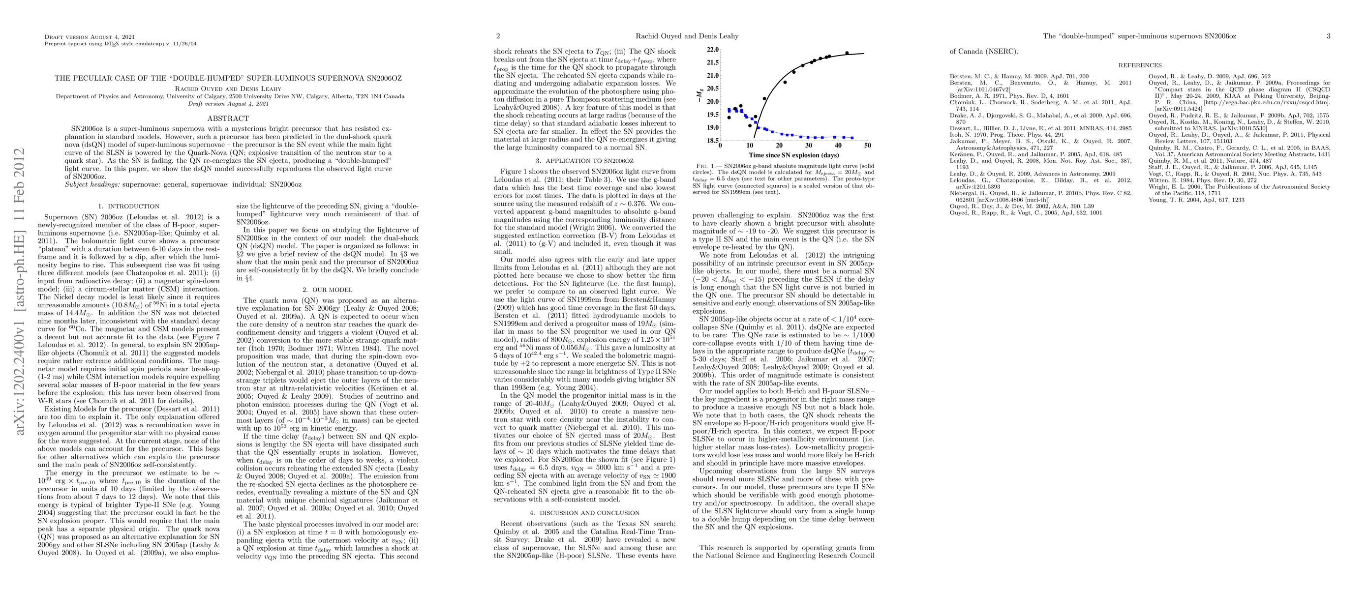 SN2006oz is a super-luminous supernova with a mysterious bright precursor that has resisted explanation in standard models. However, such a precursor has been predicted in the dual-shock quark nova (dsQN) model of super-luminous supernovae -- the precursor is the SN event while the main light curve of the SLSN is powered by the Quark-Nova (QN; explosive transition of the neutron star to a quark star). As the SN is fading, the QN re-energizes the SN ejecta, producing a "double-humped" light curve. In this paper, we show the dsQN model successfully reproduces the observed light curve of SN2006oz.