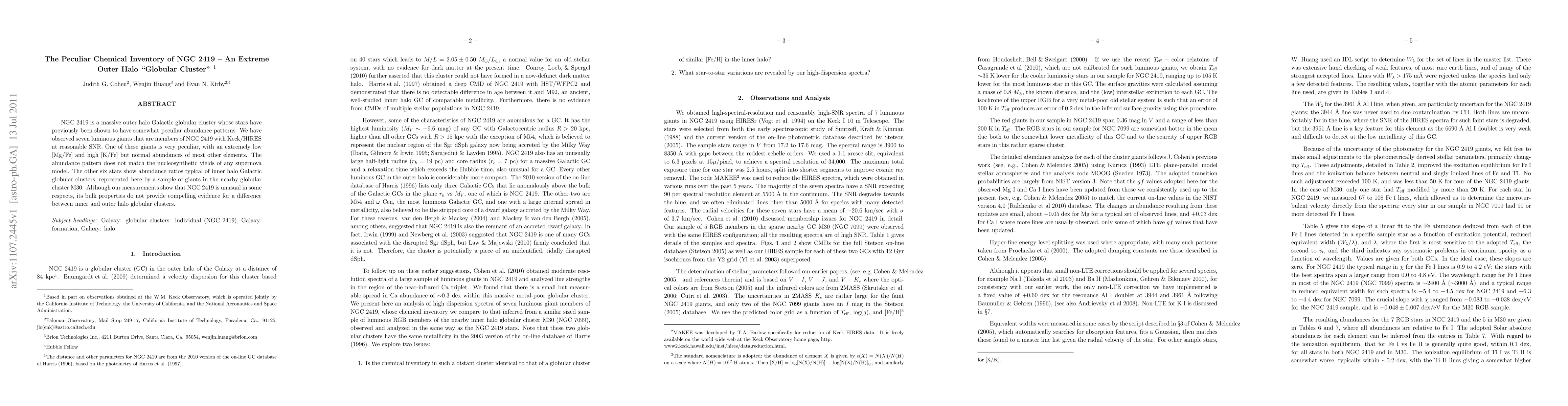 NGC 2419, an extreme outer halo globular cluster, exhibits unusual chemical abundances in one of its luminous giants, notably low [Mg/Fe] and high [K/Fe], which do not align with any known supernova model. The remaining six stars in NGC 2419 show typical inner halo abundance ratios, suggesting no significant overall difference between inner and outer halo globular clusters.